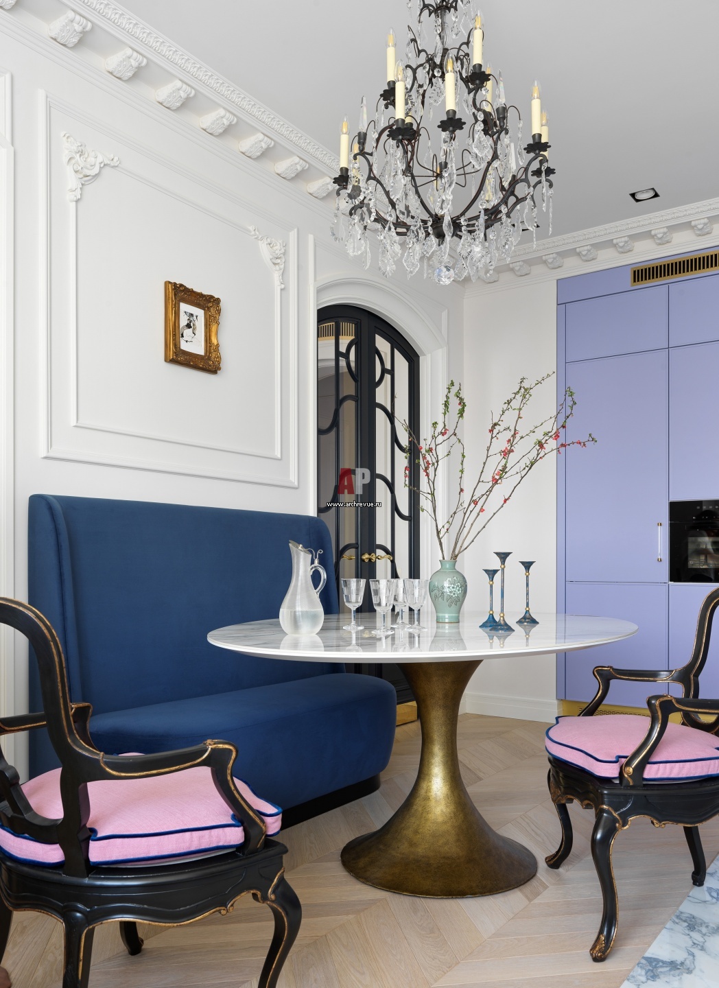 Столовая группа на кухне. Обеденный стол: подстолье – Julian Chichester, каменная столешница выполнена на заказ. Стулья, Alfonso Marina. Люстра, Vaughan.