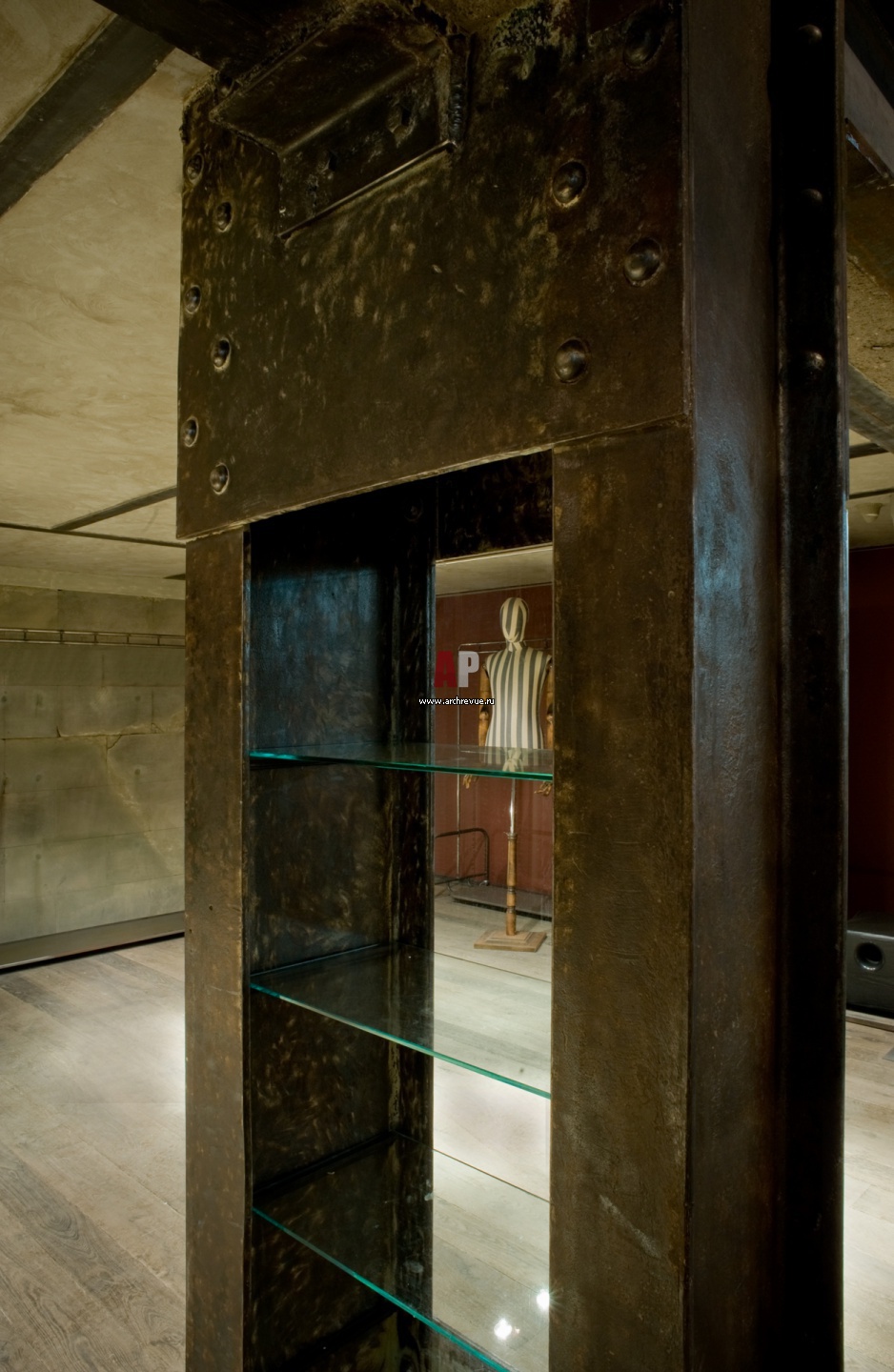 Декоративное обрамление ниш, где размещены вешала с одеждой. Рама из натурального камня, выкрашенного под металл.