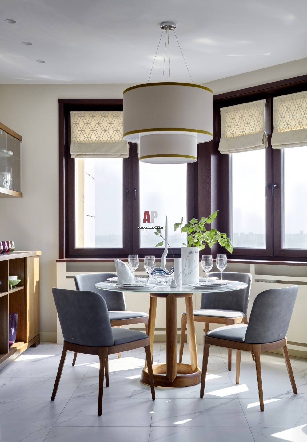 Обеденная зона расположена в эркере. Полукруглую форму окон дублирует круглый стол Bonaldo и авторский двухъярусный светильник над ним. Стулья, Cattelan Italia.