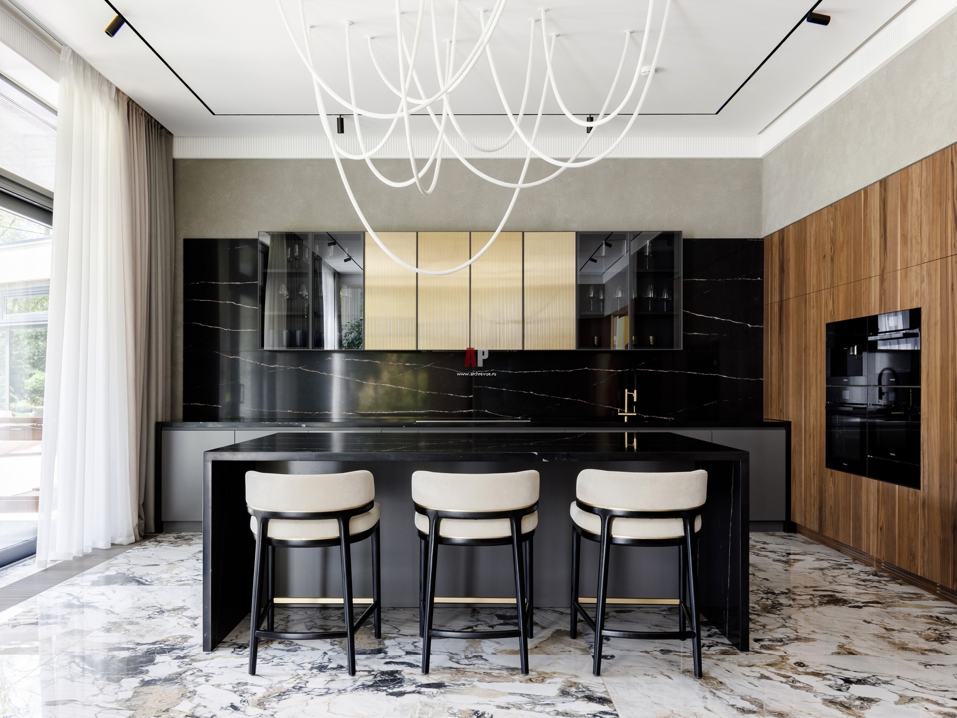 Кухня оформлена в роскошном минимализме. В панели из шпона ореха интегрирована техника. Фартук и столешницы отделаны мрамором Sahara Noir. Фасады, наполнение, шпонированые настенные панели выполнены российской столярной компанией по эскизам авторов проекта. На полу – крупноформатный керамогранит Rex.