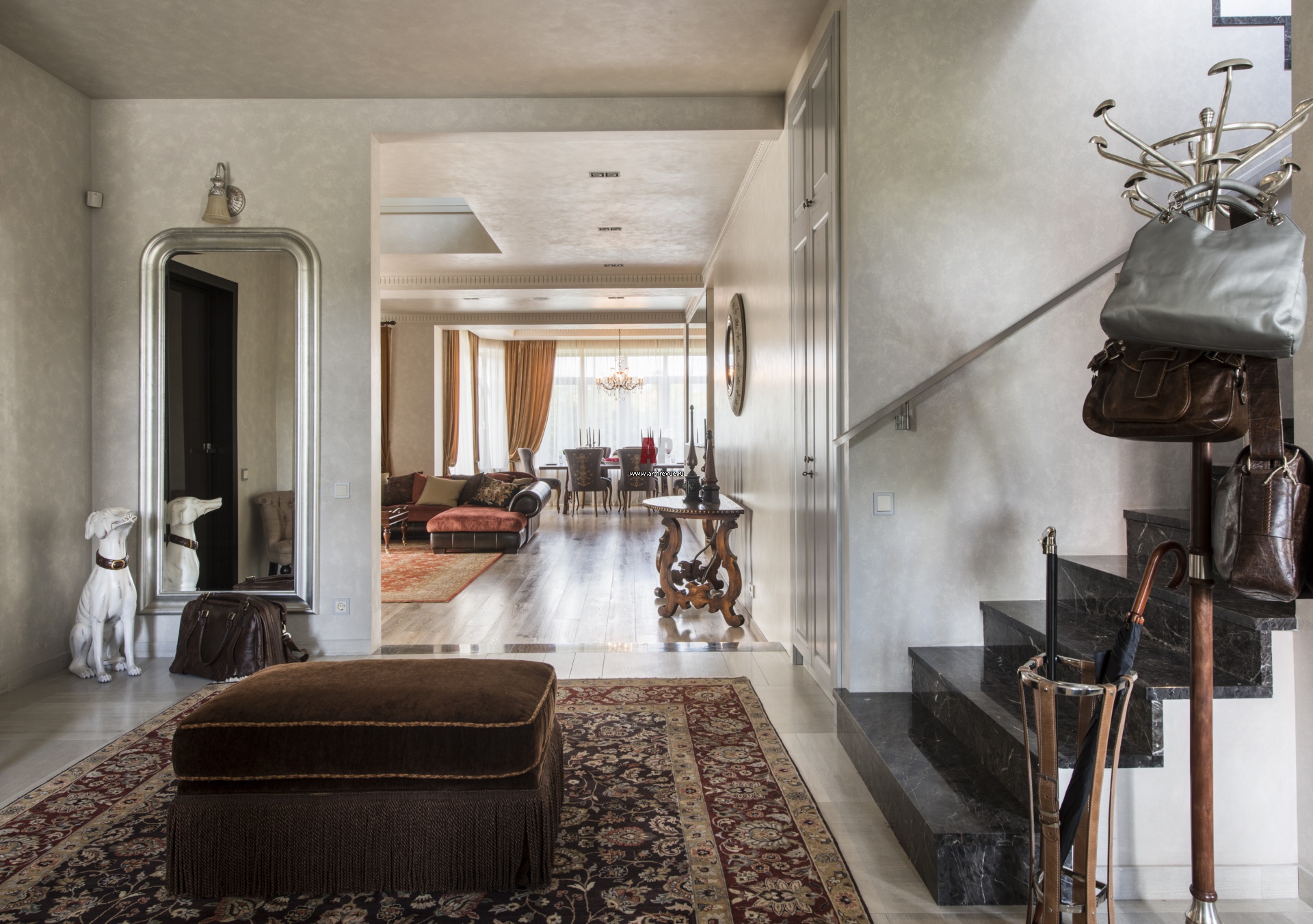 Интерьер парадной прихожей с лестницей. Стены отделаны декоративной штукатуркой. Ковер из шелка создает в интерьере уют.
