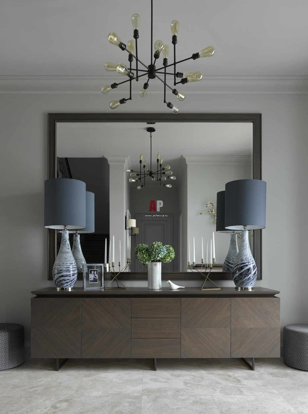 Интерьер прихожей современного дома в серых тонах. Комод сделан на заказ. Светильник, Restoration Hardware.