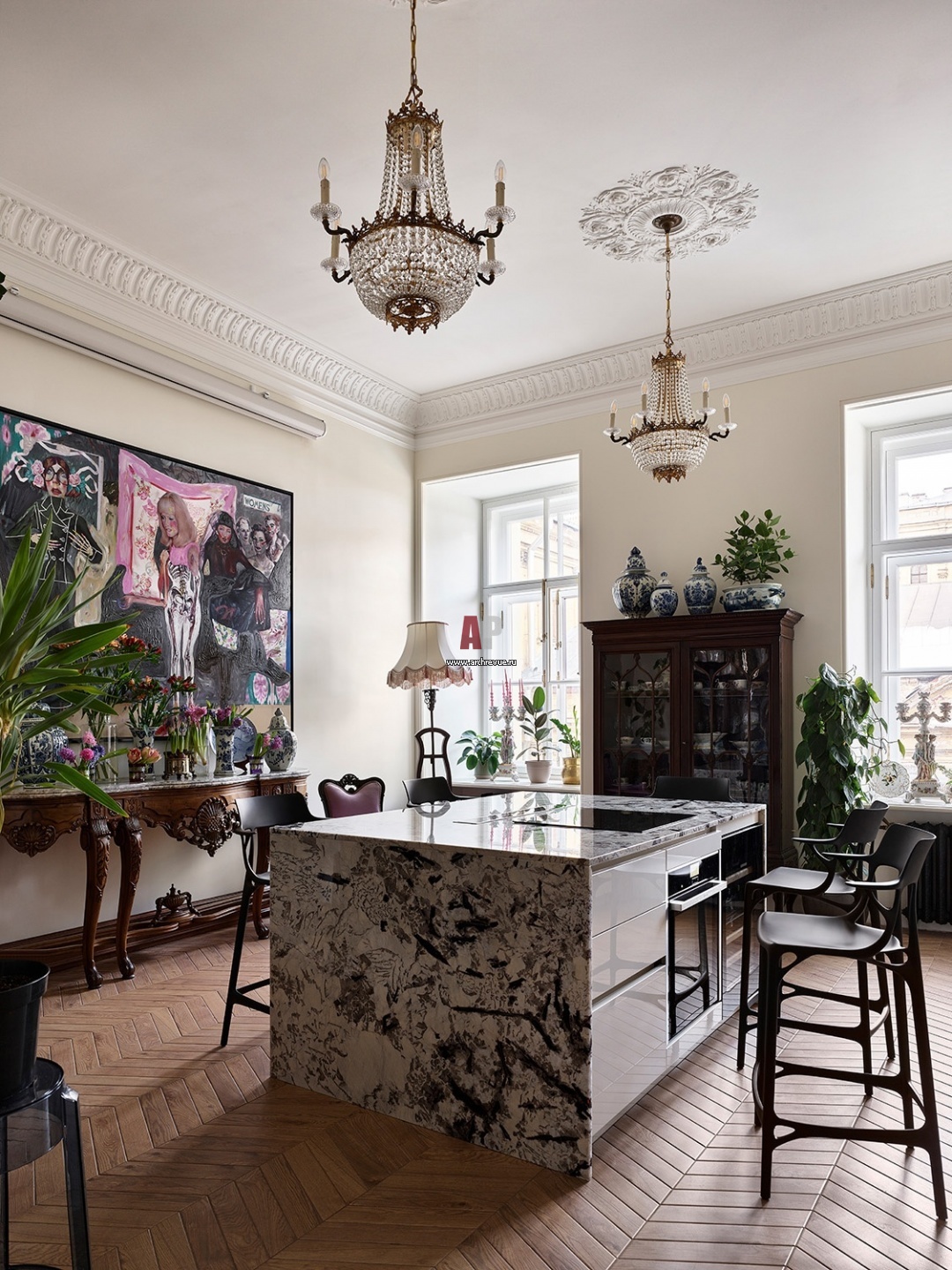 Самое современное помещение в квартире – это кухня. Кухня с каменным островом, Aster Cucine. Люстры, комоды, антикварная испанская консоль с мраморной столешницей – антиквариат. За островом – картина «Очередь» Сергея Бондырева.