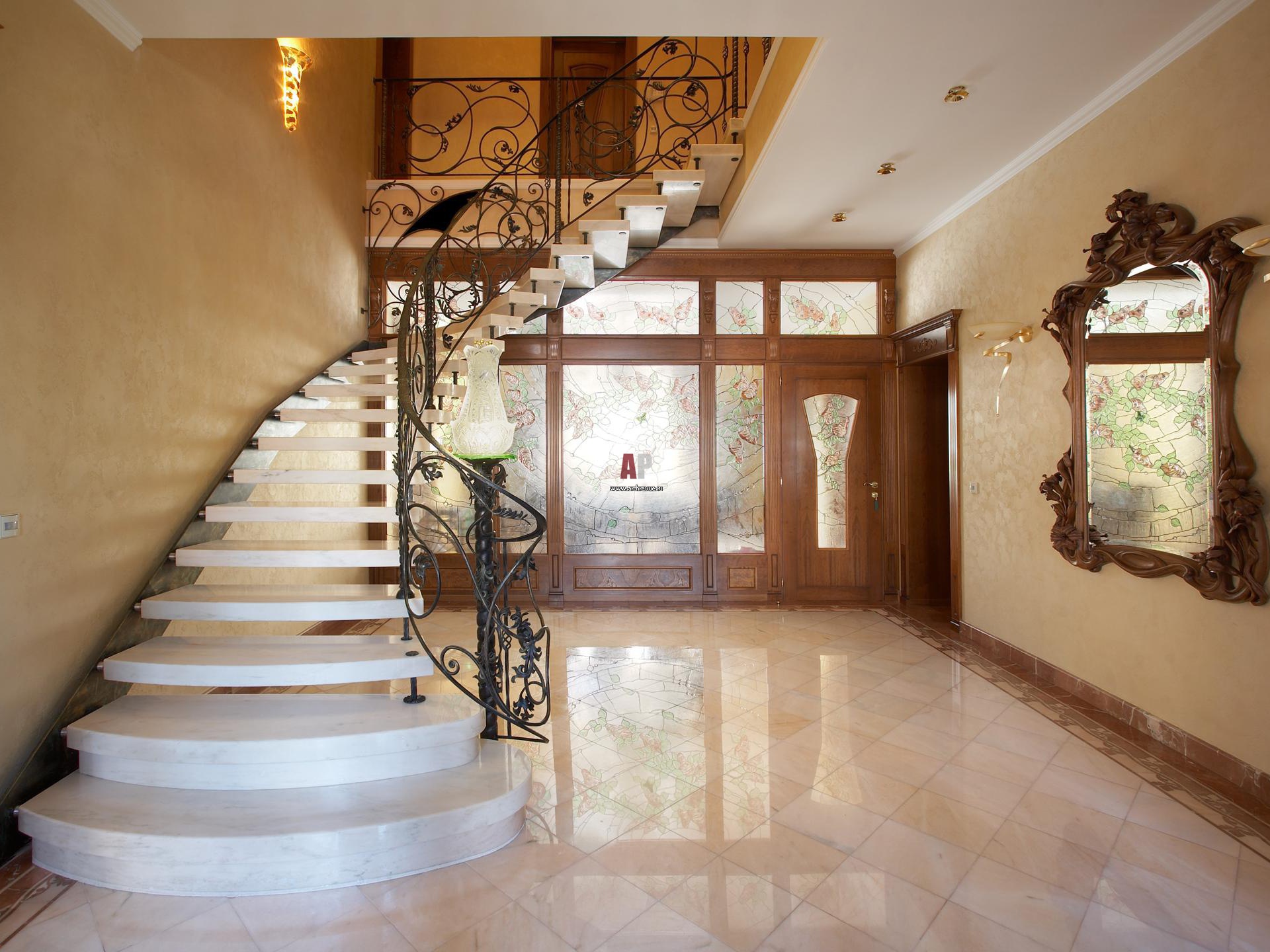 Холл первого этажа, откуда берет начало лестница, явно обозначает стилистику модерна, которая развивается в интерьере. Адреса в виде элементов ковки, витражей, резных деревянных орнаментов и рисунка полов определяют облик этой зоны.
