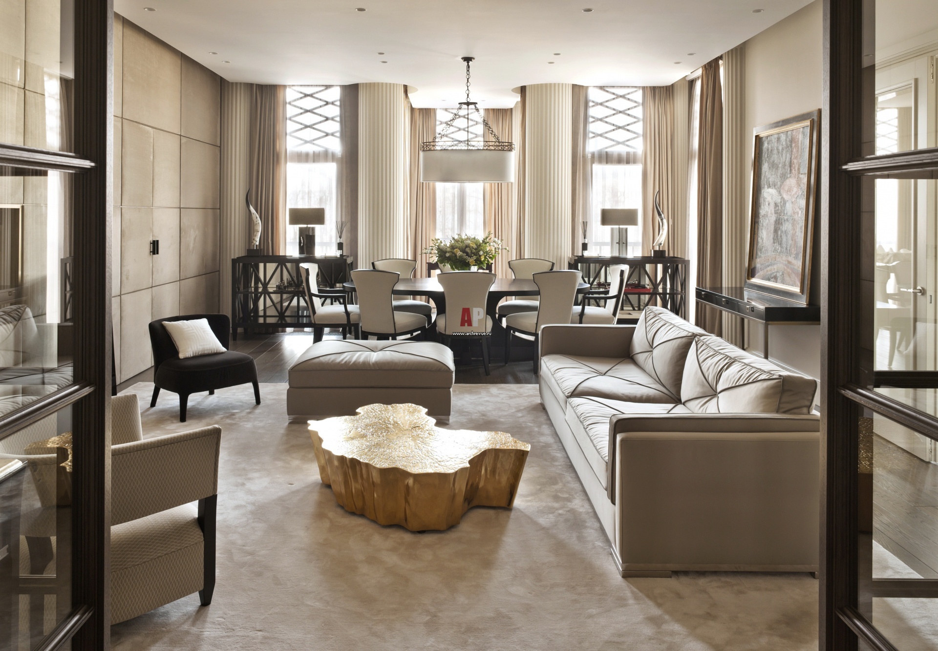 Фото интерьера гостиной московской квартиры в стиле современного ар-деко. Диван, Frato. Журнальный столик, Boca do Lobo. Консольный столик, Bolier.