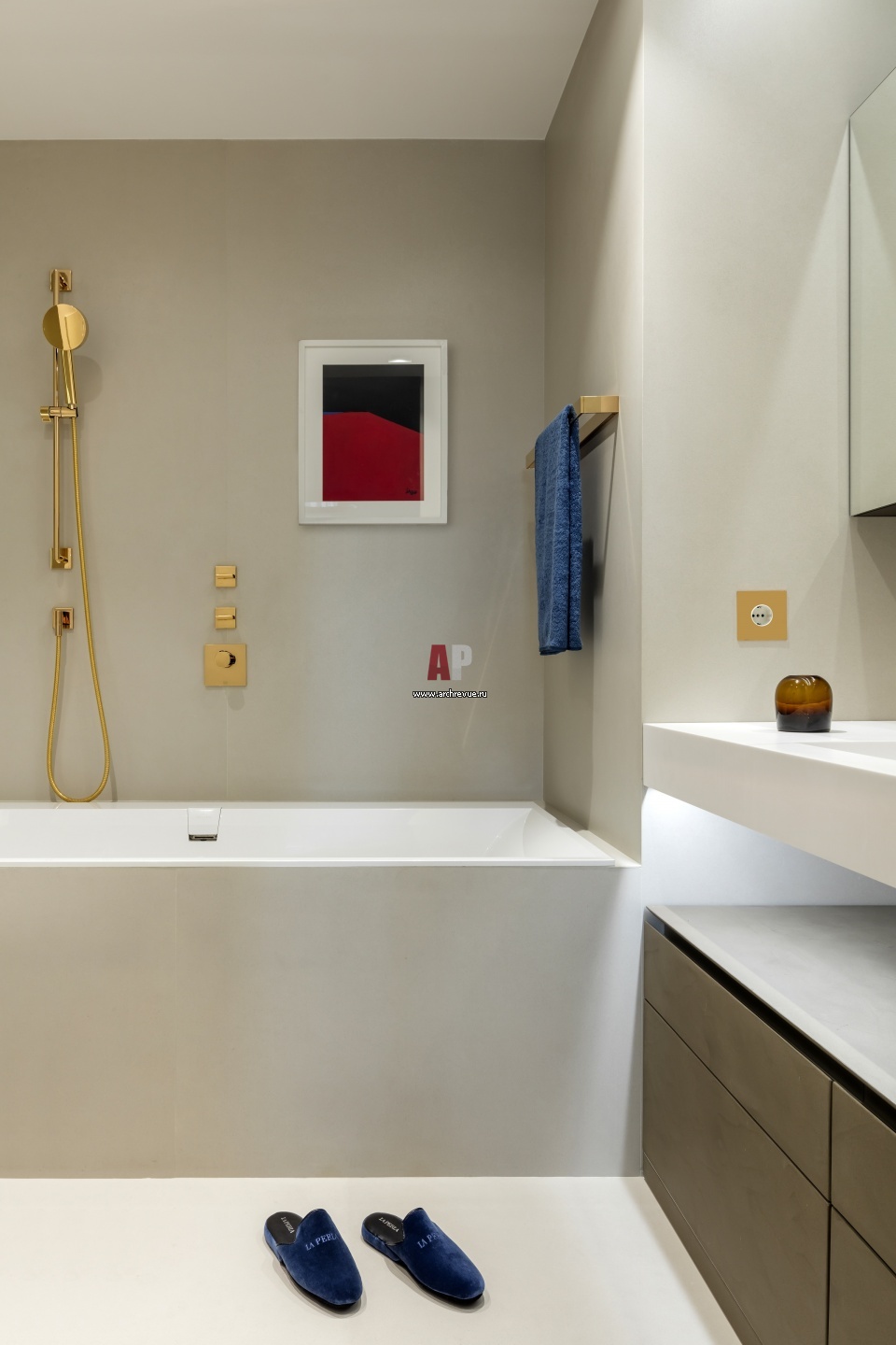 Ванная комната при хозяйской спальне выглядит роскошно. Стены облицованы тонкой в 3 миллиметра плиткой крупного формата (3Х1 метр) Lea Ceramiche, которая создает эффект покрашенной поверхности. Ванна, Villeroy & Boch. Золотые смесители, Dornbracht.