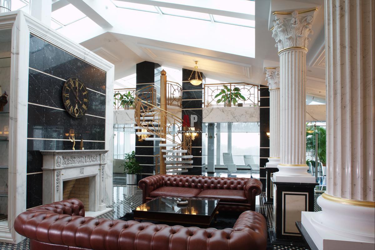 Камин, украшенный мраморным барельефом, выполнен по заказу архитектора в Италии. Рядом с порталом вокруг ковра из натурального меха расположены кожаные диваны «Честерфилд».