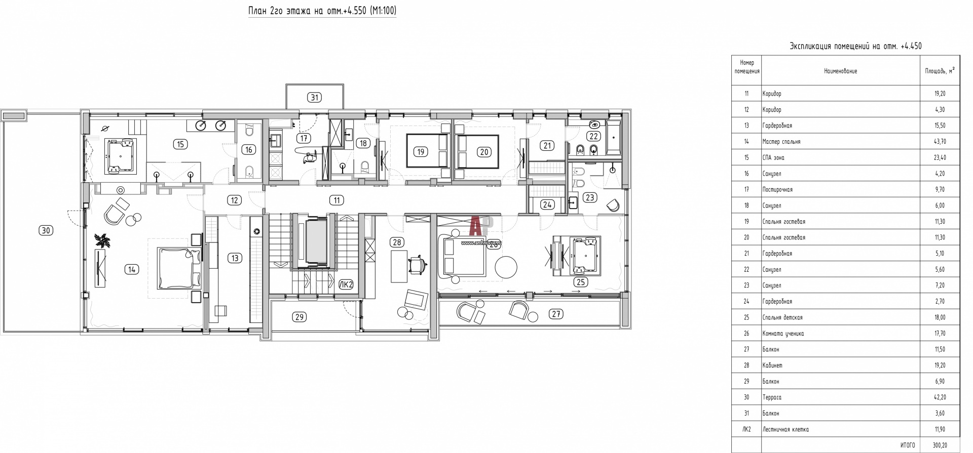 План второго этажа двухэтажного современного дома на Черном море. Общая площадь – 700 кв. м.