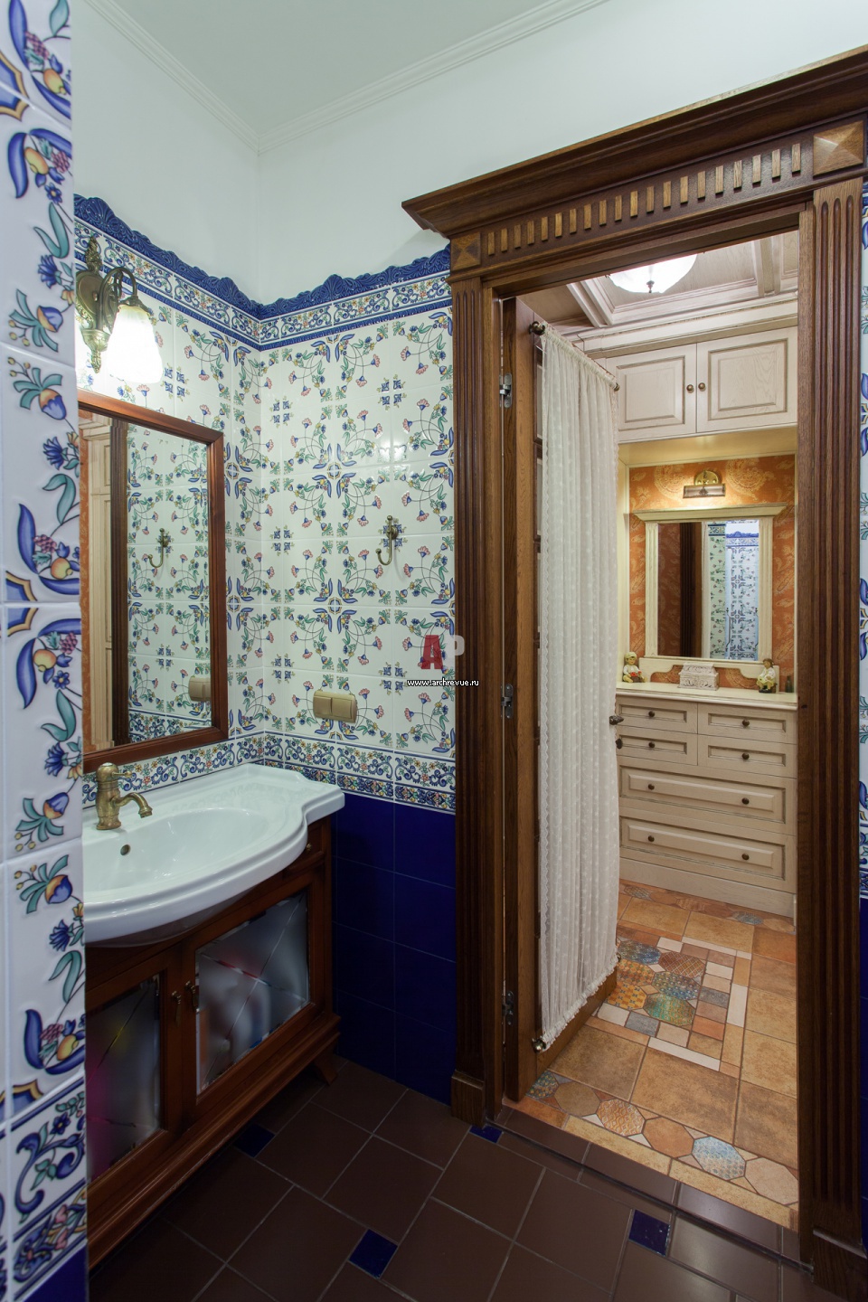 В квартире два санузла: гостевой санузел и большая хозяйская ванная. Оба помещения исполнены в английском стиле с использованием керамической плитки ручной работы из этнических коллекций. Поставщик плитки, «Интерьерный салон» («Биг Бен»).