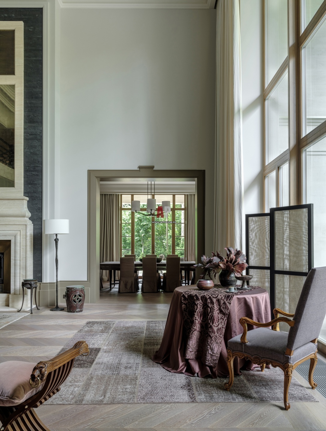 Интерьер двусветной гостиной с панорамным остеклением выглядит еще больше и параднее благодаря панорамному остеклению, светлым стенами и контрасту с темными соседними помещениями кабинета и столовой.