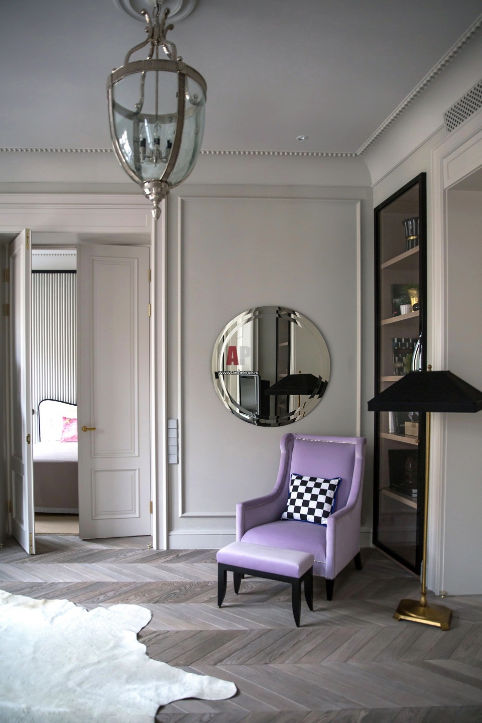 Интерьер задумывался как парижский pied-à-terre (квартира для временного проживания). Стены выкрашены однотонной матовой краской. Зеркало сделано по эскизам. Люстра, Eichholtz. Кресло и пуф, Andrew Martin.
