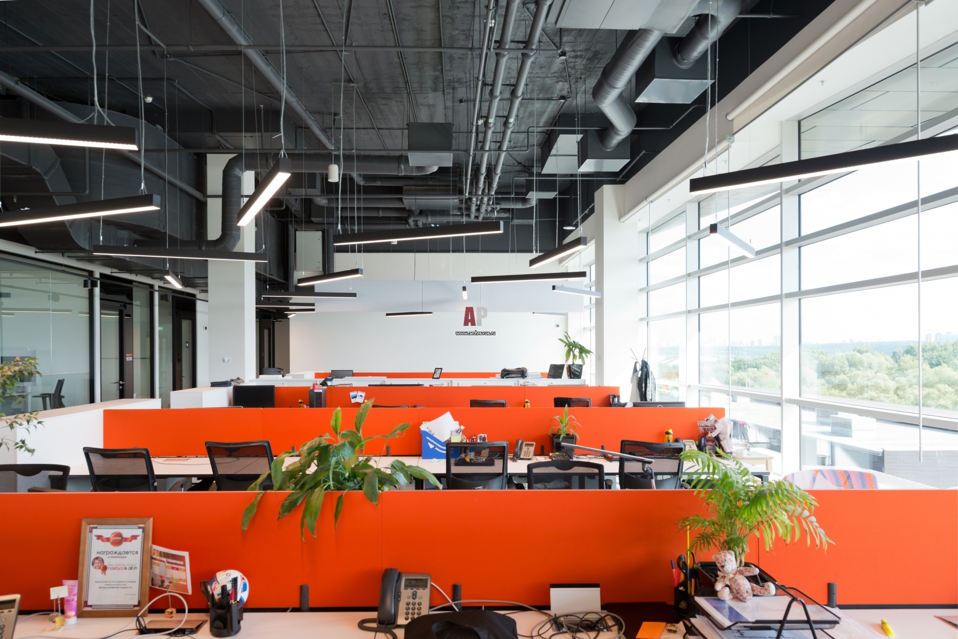 Рабочие места расположены ближе к панорамным окнам, из которых открывается замечательный вид на город. Столы расставлены на комфортном расстоянии друг от друга, между рядами достаточно места, можно воспользоваться специальными выдвижными тумбочками с сидениями для организации внутренних переговоров.
