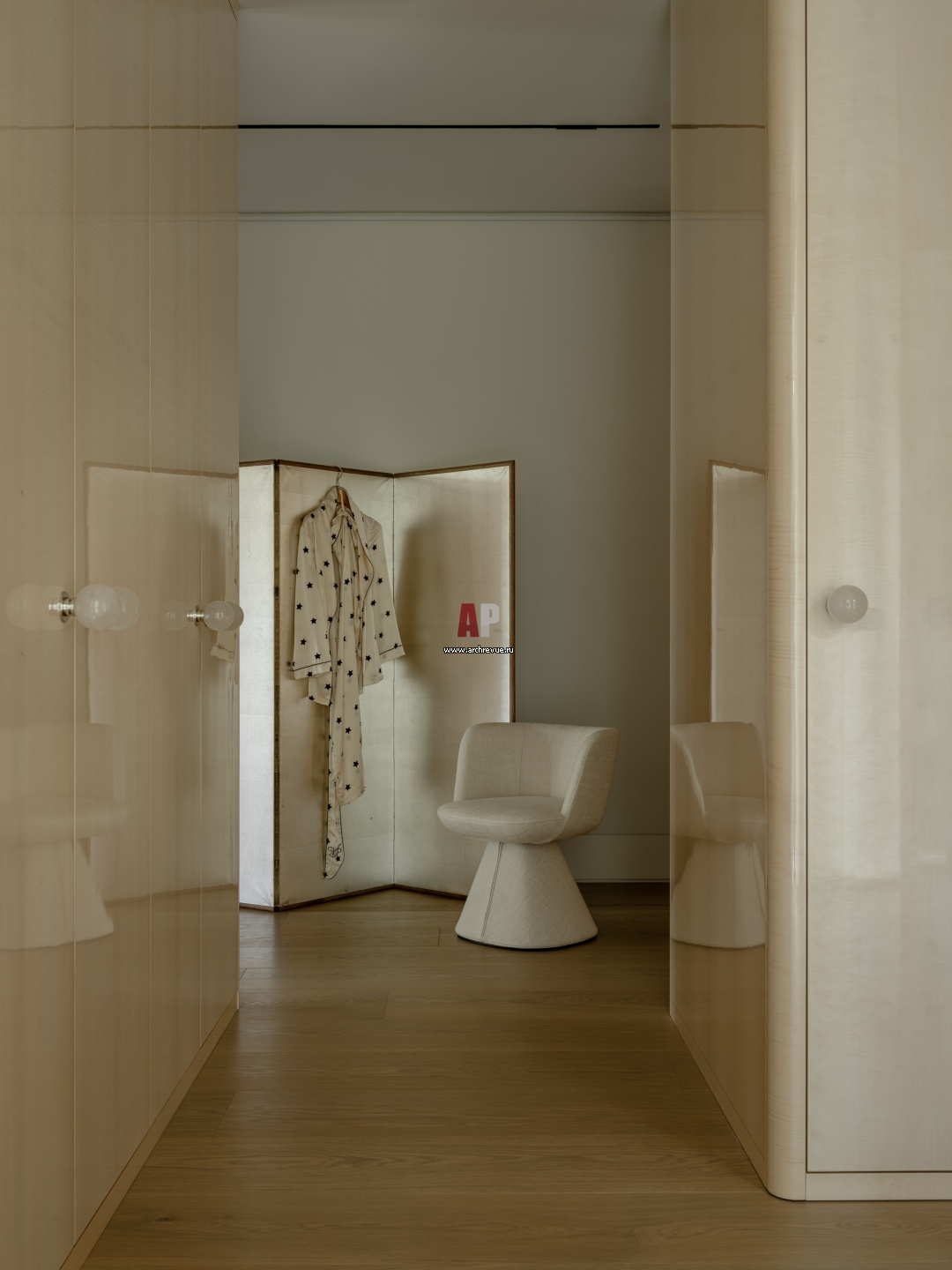 Мебель из сикомора с глянцево-перламутровым финишем и фурнитурой из натурального хрусталя изготовлена на заказ по эскизам дизайнера, компания «Ольха-Декор».
