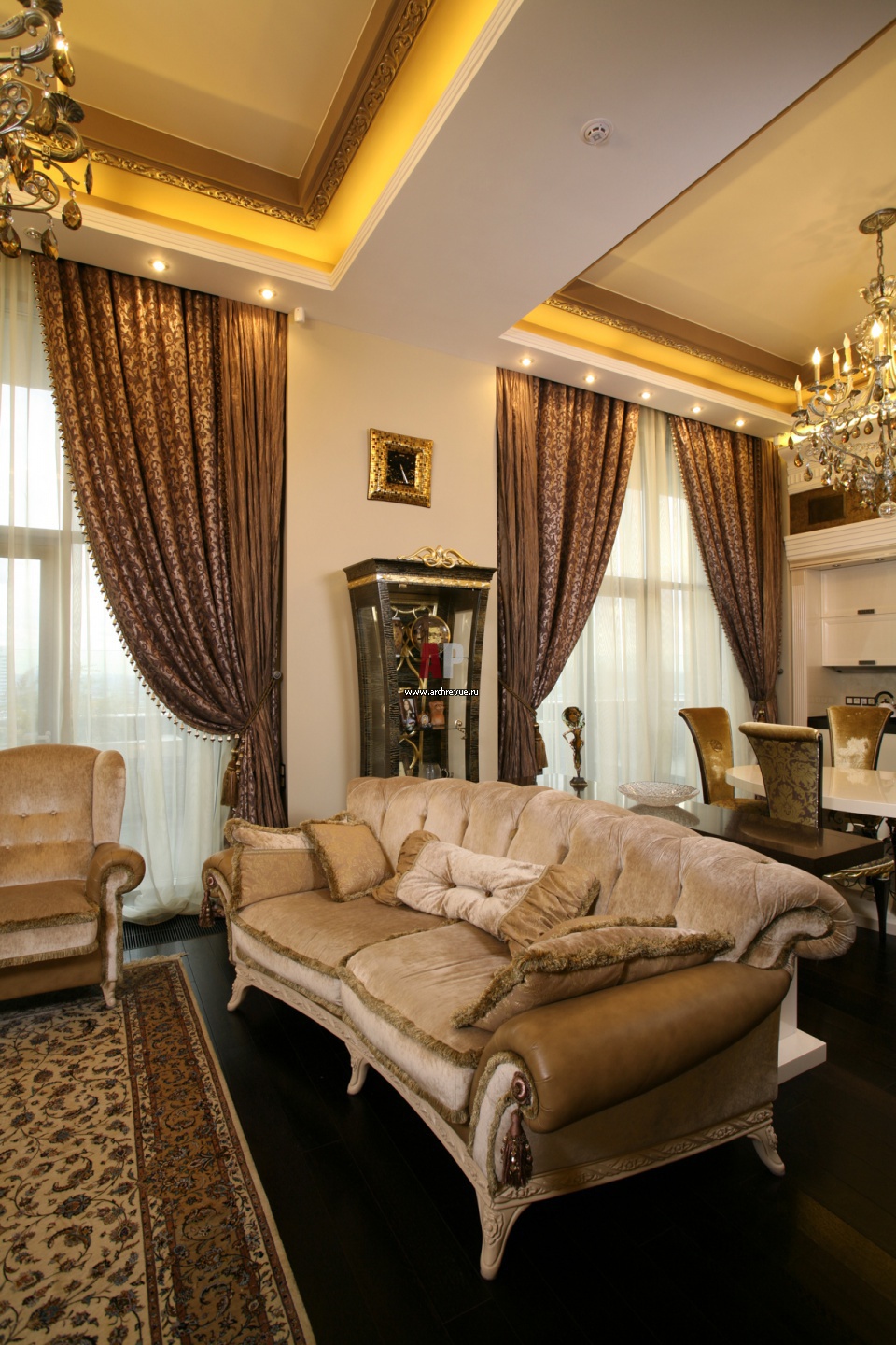 Интерьер гостиной в классическом стиле. Золотисто-бежевая цветовая гамма придает помещению мягкость и нарядный вид.