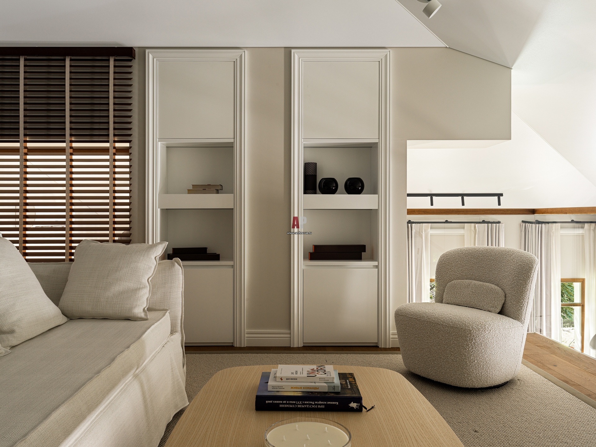 Кабинет с зоной отдыха на антресоли. Диван с раздвижным спальным местом, Gervasoni, модель Ghost, Журнальный столик, Pedrali.