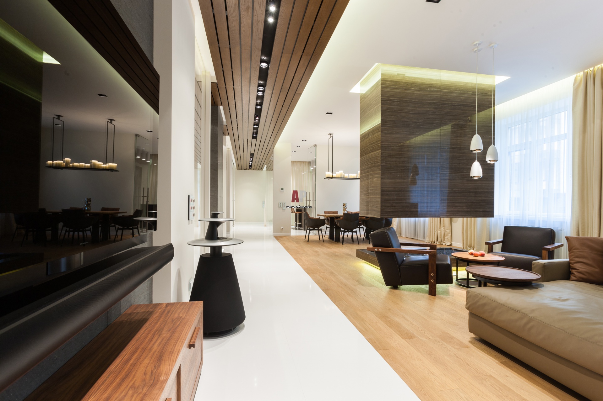 Вектор движения подчеркивает отделка пола. Жилая часть оформлена светлой дубовой доской, «проходная» - белым камнем. Импровизированный коридор акцентирует и потолок из деревянных реек.