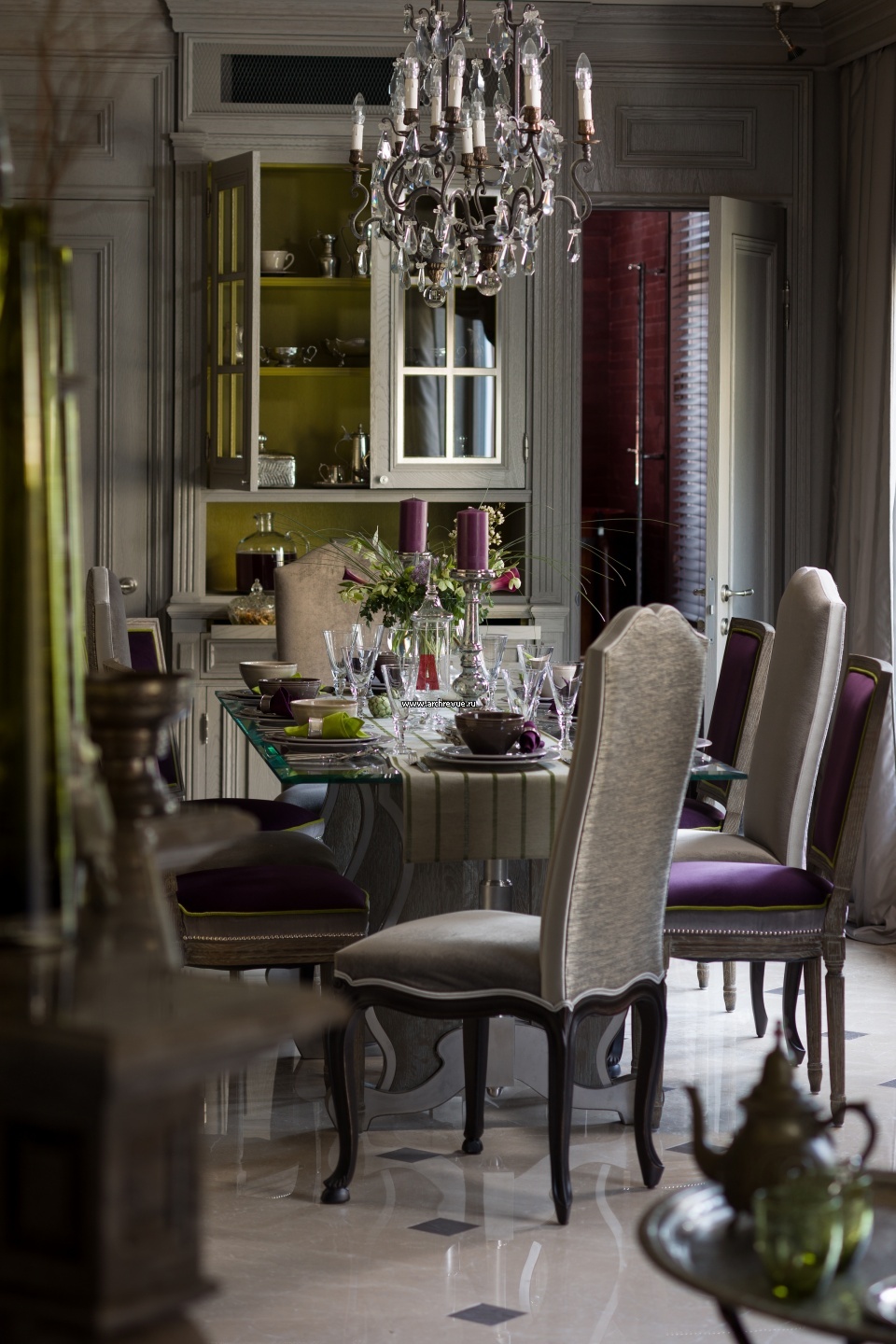 Интерьер столовой в духе французской неоклассики. Обеденная группа расположена на месте присоединенного узкого балкона.