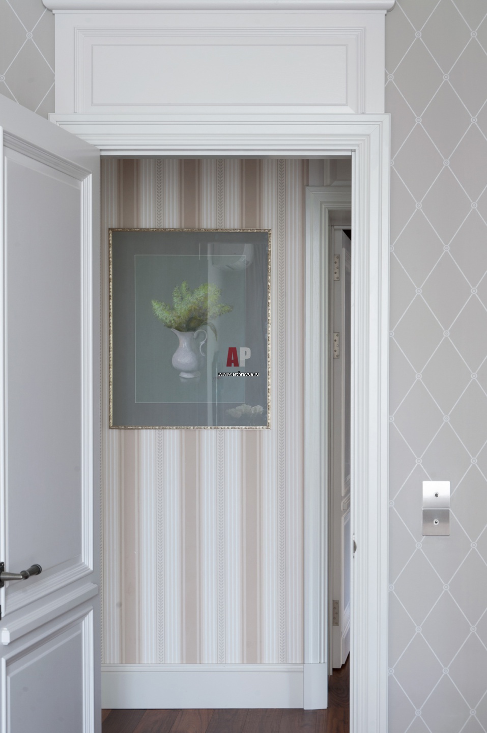 Фото интерьера коридора. Межкомнатная дверь, дверной портал из дерева с белым эмалевым финишем. Обои пастельного цвета в полоску и ромб.