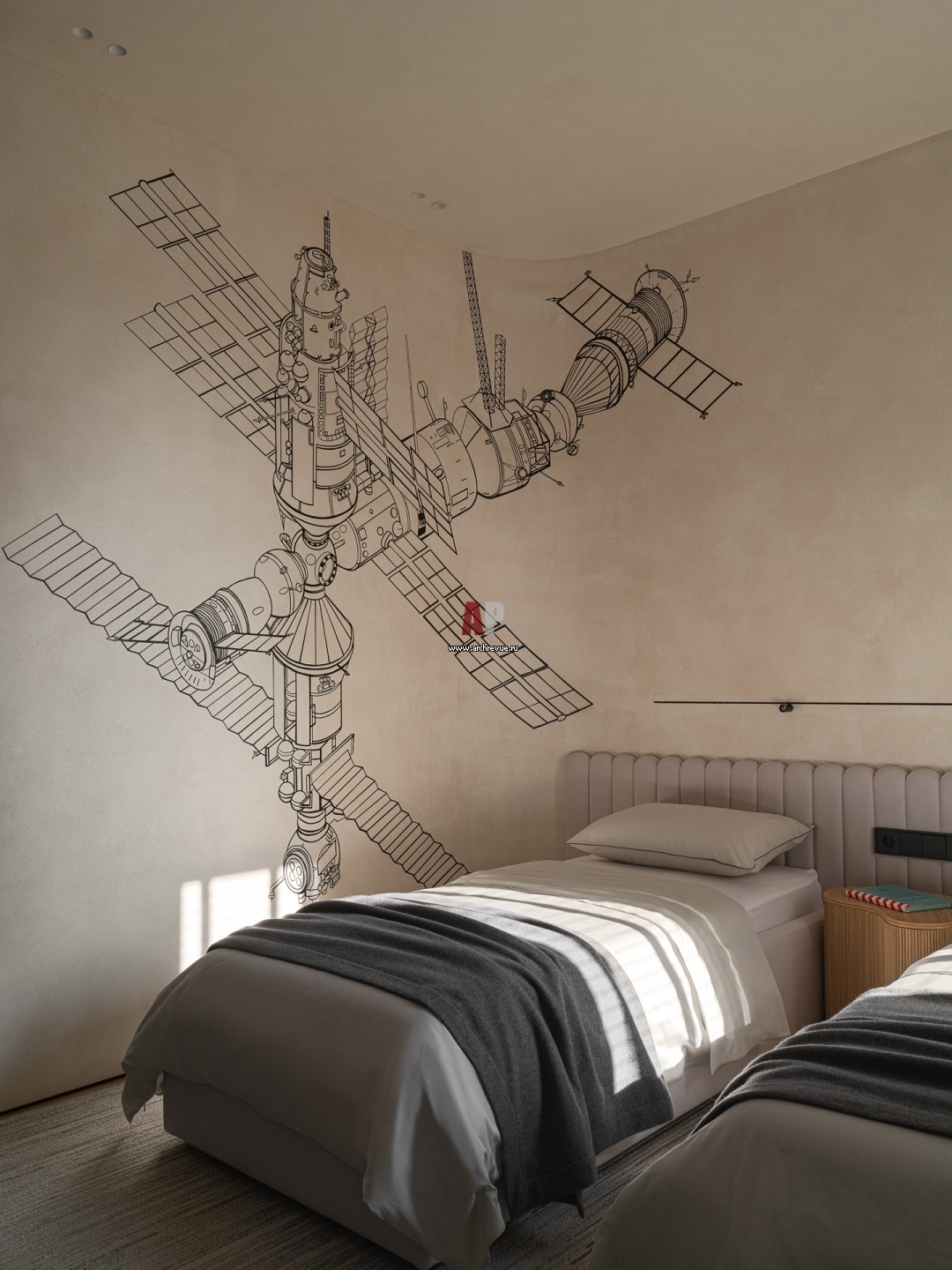 Тема оформления комнаты мальчиков – космос. На закругленной стене – рисунок со станцией «Мир».