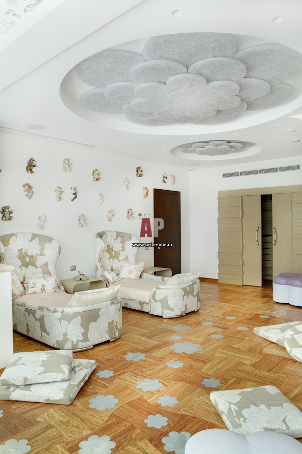 Фото интерьера детской комнаты. В пол из оливы, поставщик «Паркет Ленд», вмонтированы металлические вставки с отпечатками ножек и ручек маленьких обитателей комнаты. Многоуровневые радиусные потолки декорированы оригинальными светильниками-цветками Fantom Brand.
