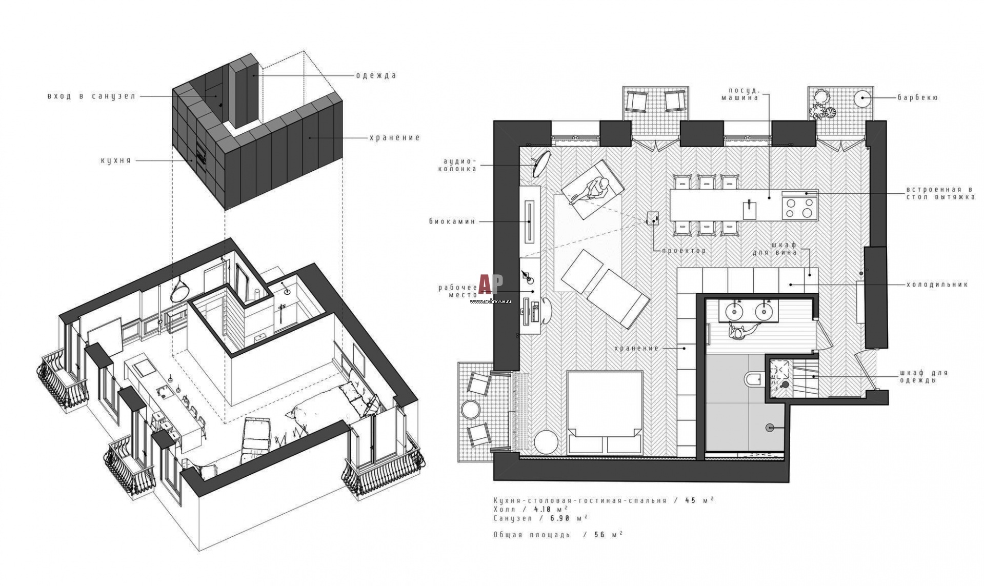 План квартиры-лофта с расстановкой мебели площадью 56 кв. м