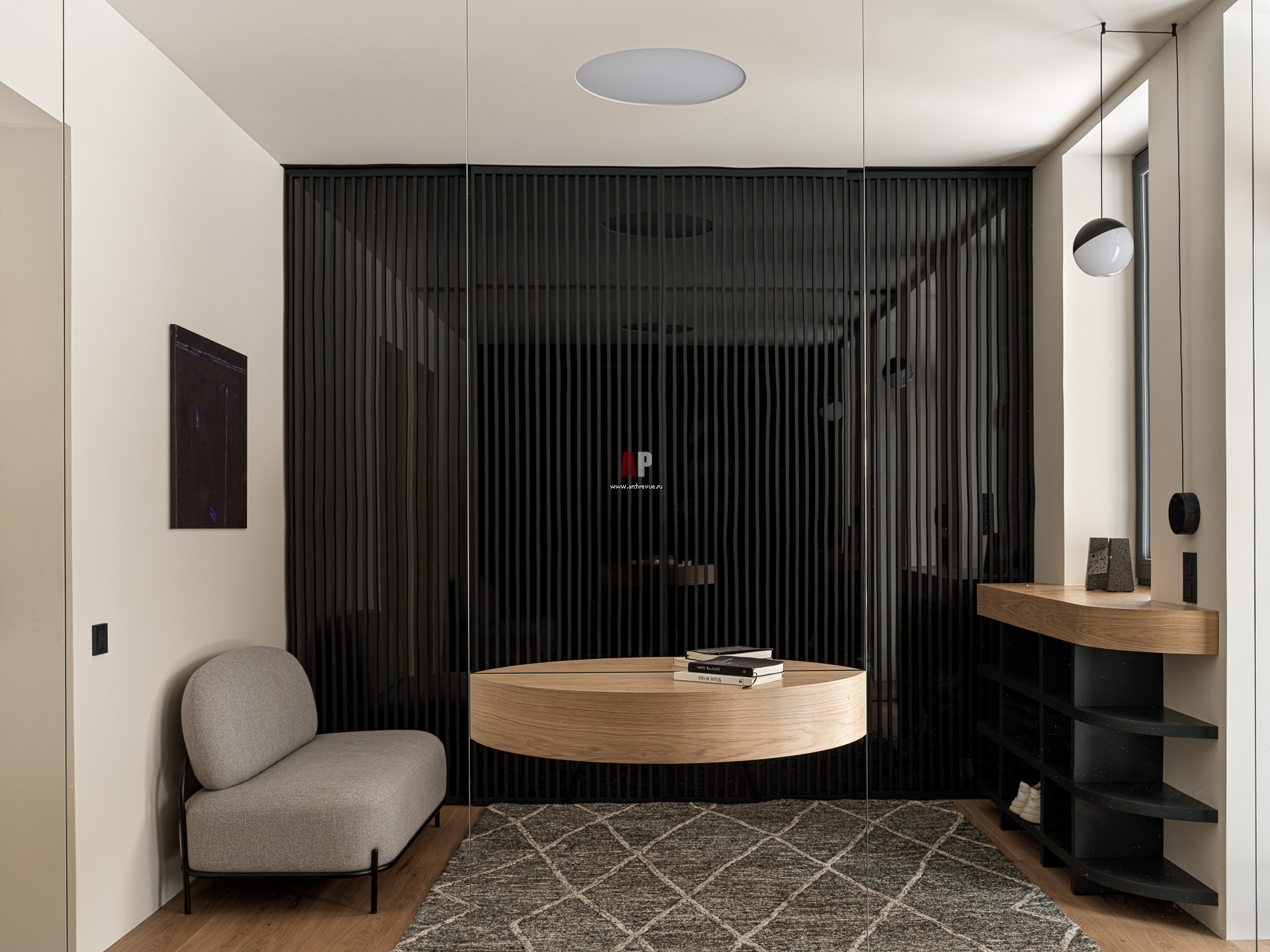 Прихожая с гардеробной. Раздвижные двери в гардеробную выполнены из черного стекла.