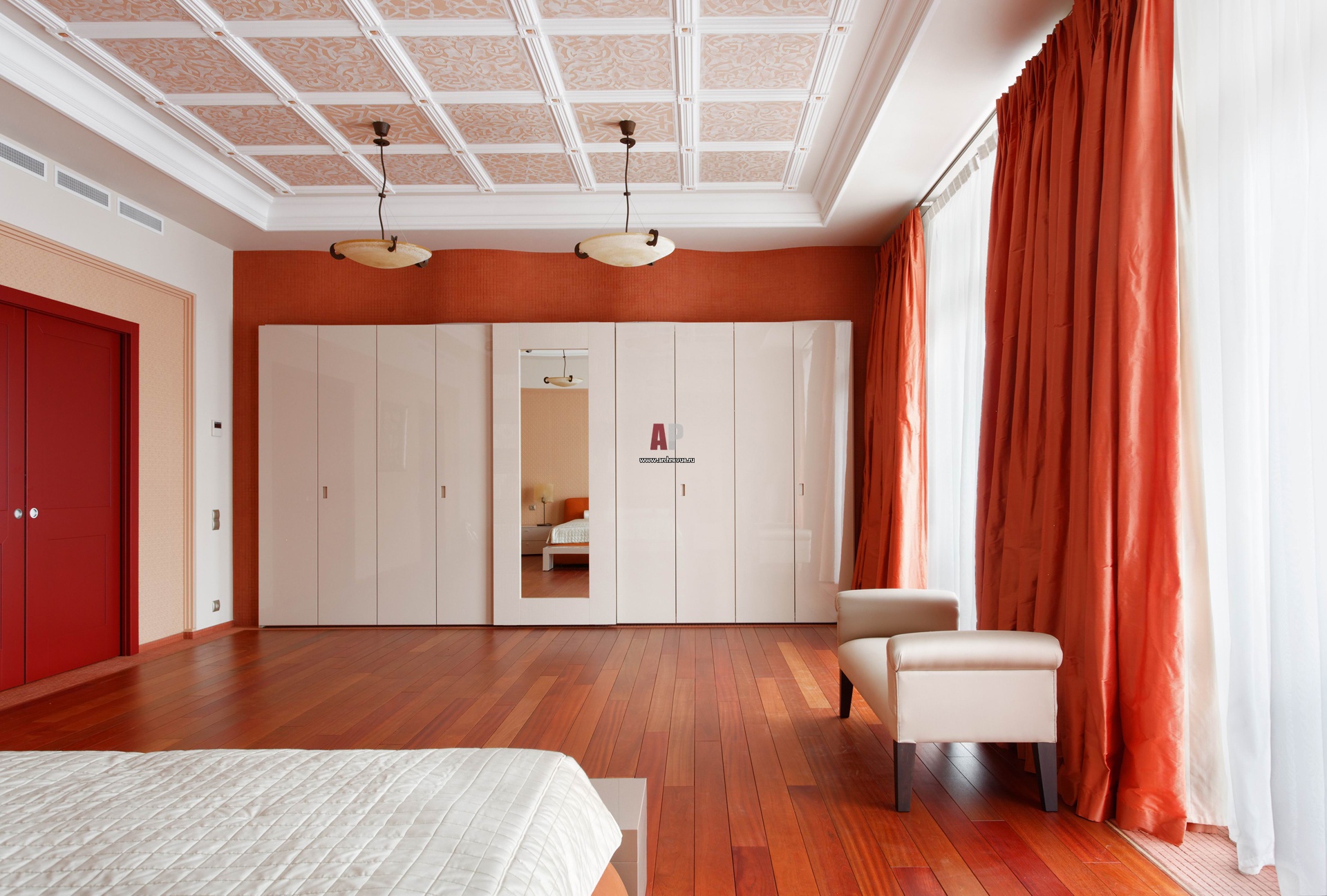 Фото интерьера зоны гардеробной в спальне. Шкаф с белой глянцевой поверхностью утоплен в скульптурную стену. Стена облицована терракотовой мозаикой с матовой фактурой.