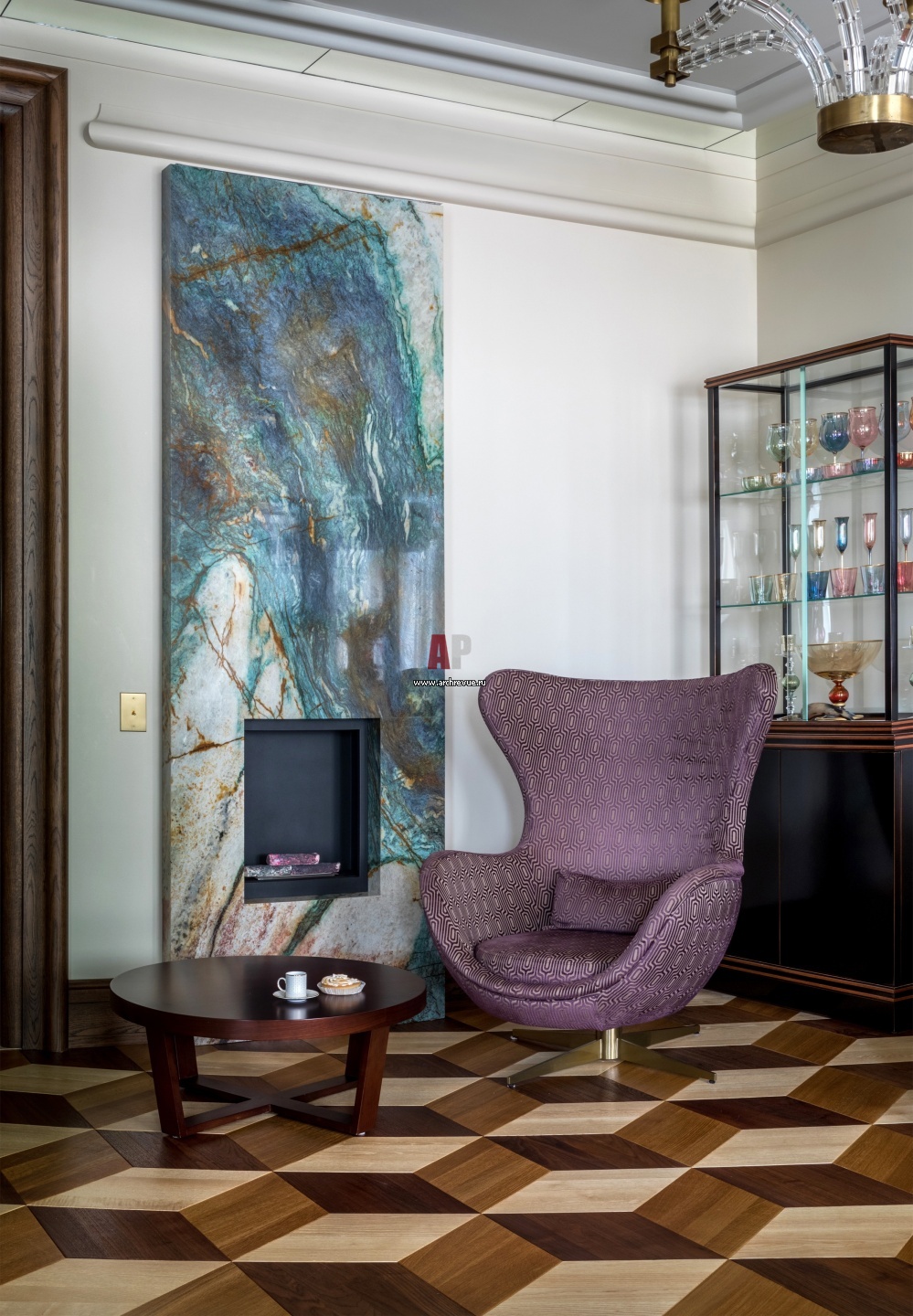 Портал камина с электрической топкой облицован слэбом гранита Van Gogh в бирюзово-зеленой цветовой гамме, он выглядит как живописное панно, которому не требуется никакая рама.