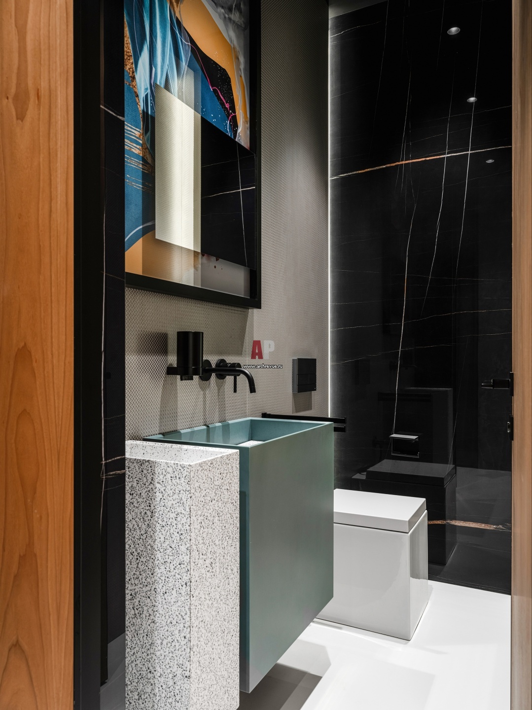 Гостевой санузел оформлен в темной палитре. Раковина сделана по эскизам автора проекта из искусственного камня. Унитаз, Simas. Смеситель, Gessi.