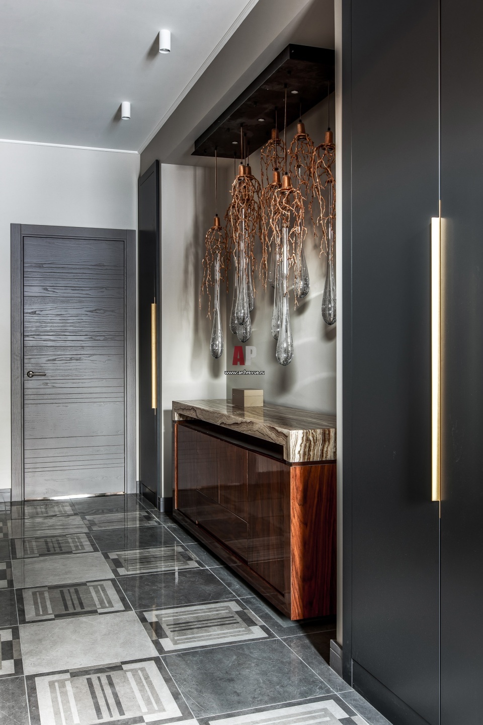 Небольшой таунхаус в стиле изящного минимализма. Интерьер прихожей. Комод выполнен на заказ, его фасад сделан из шпона африканского экзотического дерева, столешница – мраморный слэб. Светильники, Serip.
