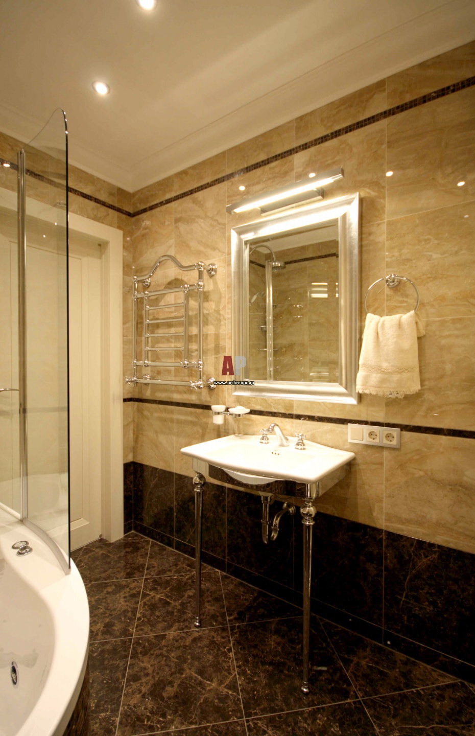 Хозяйский санузел отделан керамическим гранитом, достоверно имитирующим мрамор. Изящный умывальник на тонких металлических ножках.