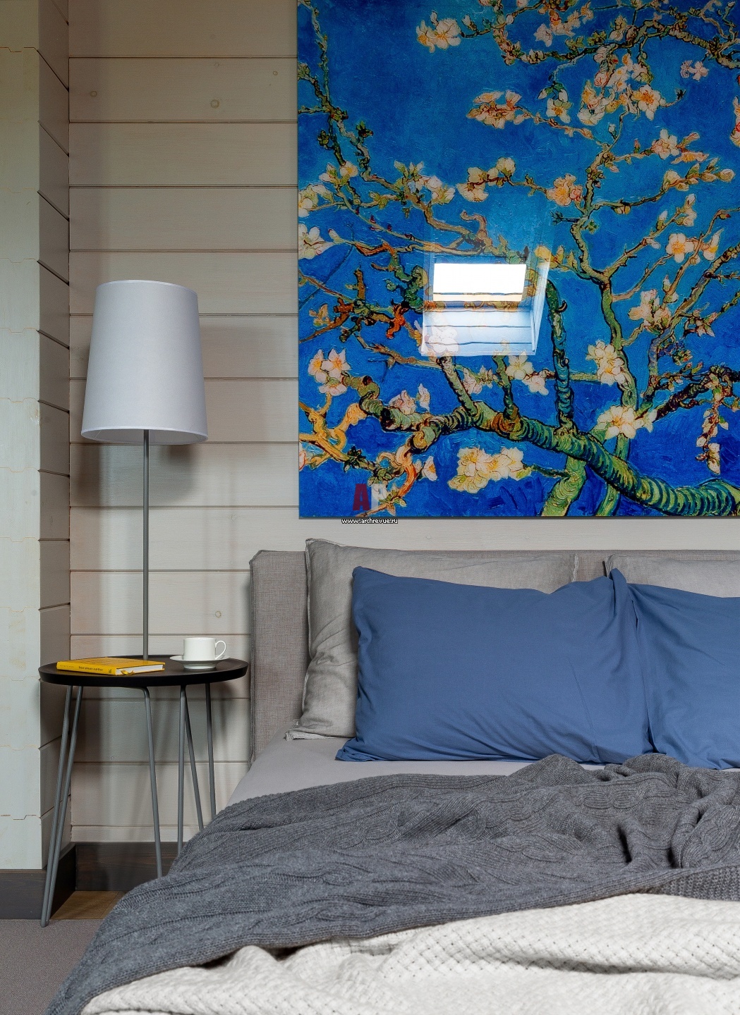Спальня на мансардном этаже. Мансардные окна, VELUX. Мебель, Gervasoni.
