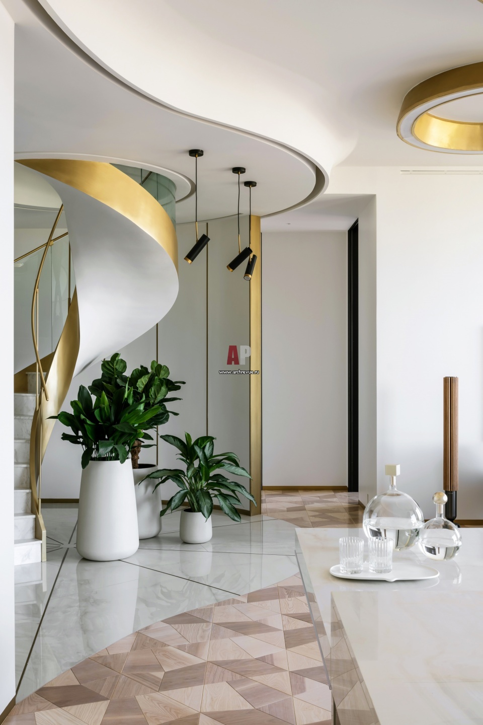 В гостиной и спальнях на полу использован щитовой паркет с эффектом мозаики. Пять разных распилов дерева трех пород выложены ромбами.