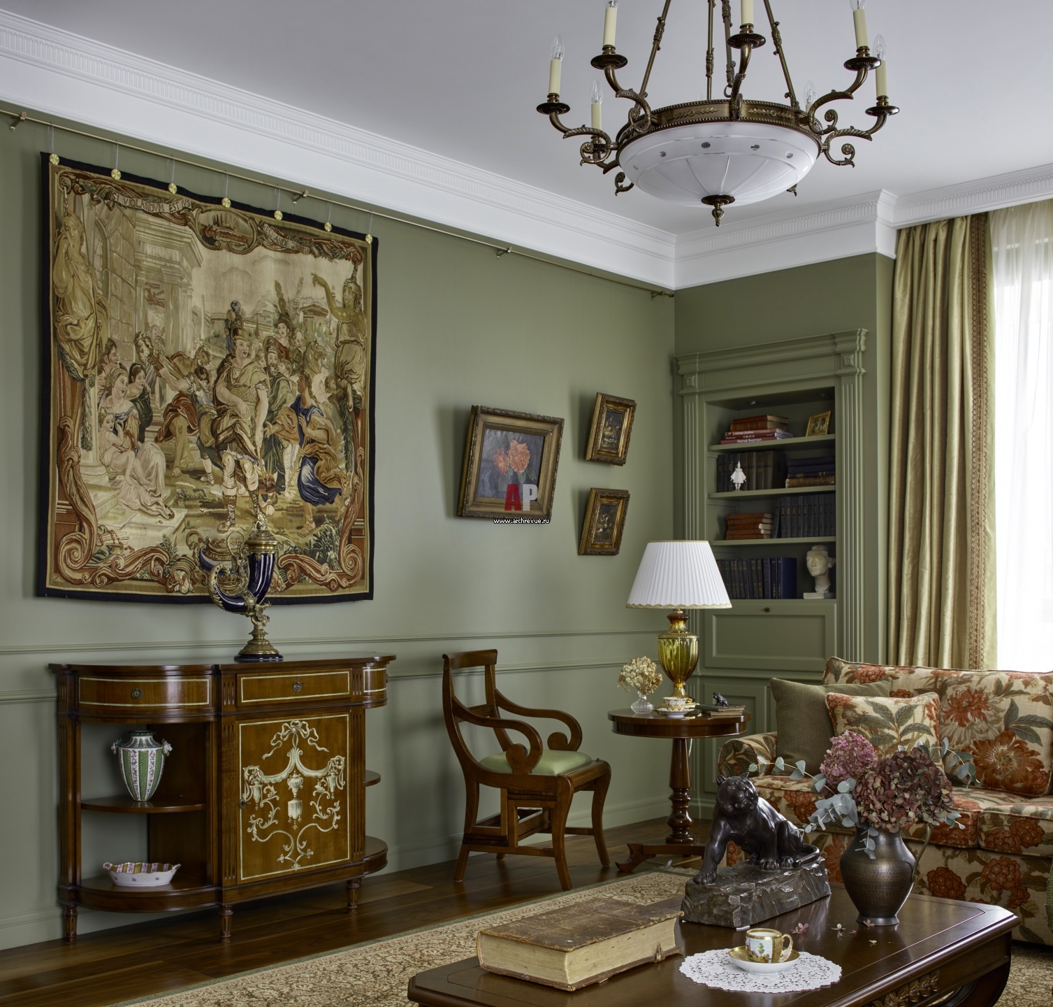 Дизайн гостиной с насыщенными зелеными стенами выполнен в духе традиционных викторианских интерьеров.
