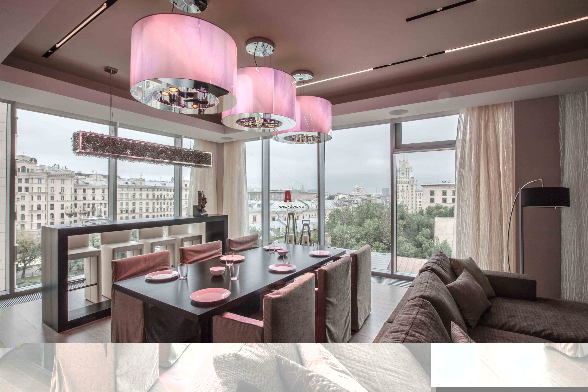 Парадную столовую в общем объеме гостиной акцентируют три светильника-барабана Artemide с функцией RGB. Обеденный стол, стулья, Wittmann.