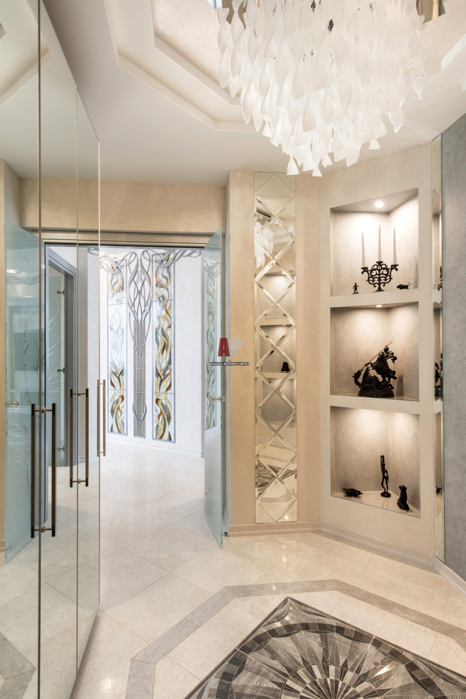Интерьер прихожей выглядит светлым и воздушным за счет зеркальных фрагментов и люстры из кристаллов Swarovski. Многоугольное помещение с угловыми нишами украшает напольное панно из керамического гранита с простым геометрическим орнаментом.