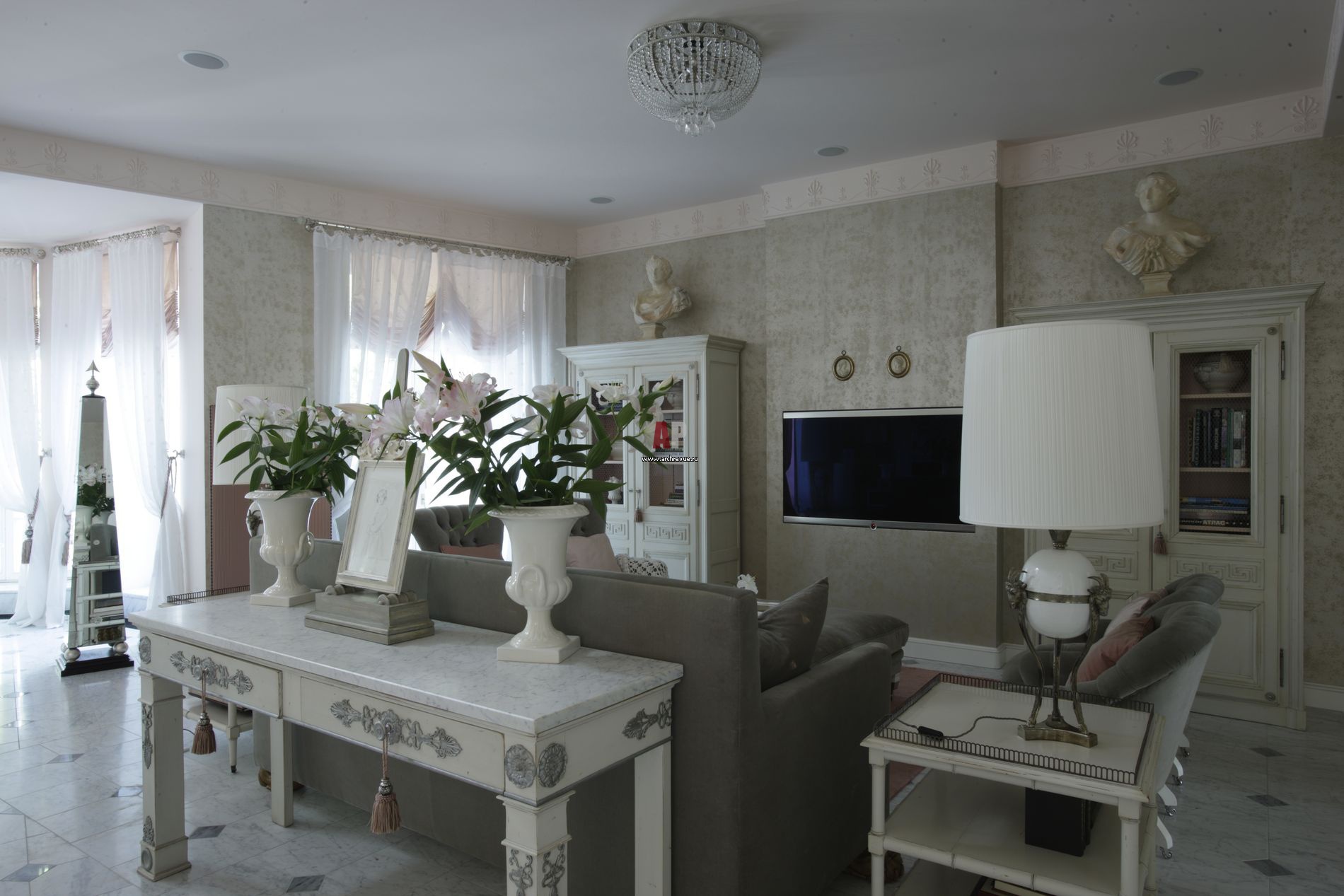 На стенах парадного зала – обои с металлизированной фактурой. Они выглядят так, словно перед нами не новый дом, а историческая французская резиденция.