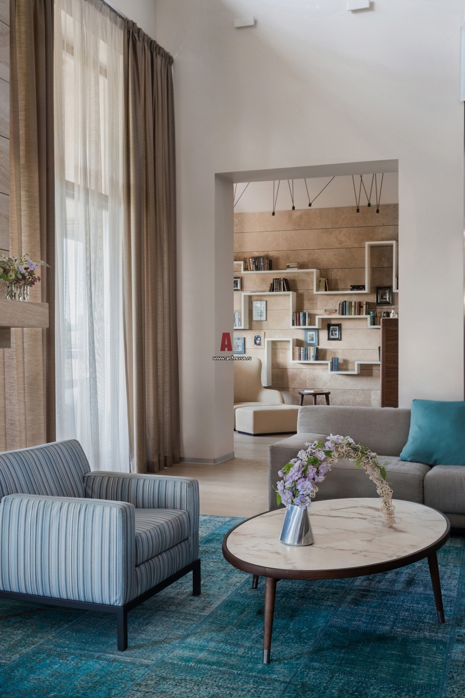 Интерьер двухэтажного загородного дома с речной панорамой