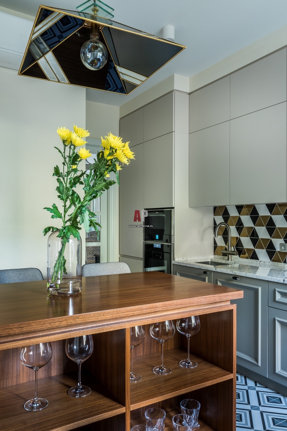 Кухня. Барная стойка выполнена из красно-коричневого дерева. Над ней – винтажная люстра, Италия, 1960-е годы.