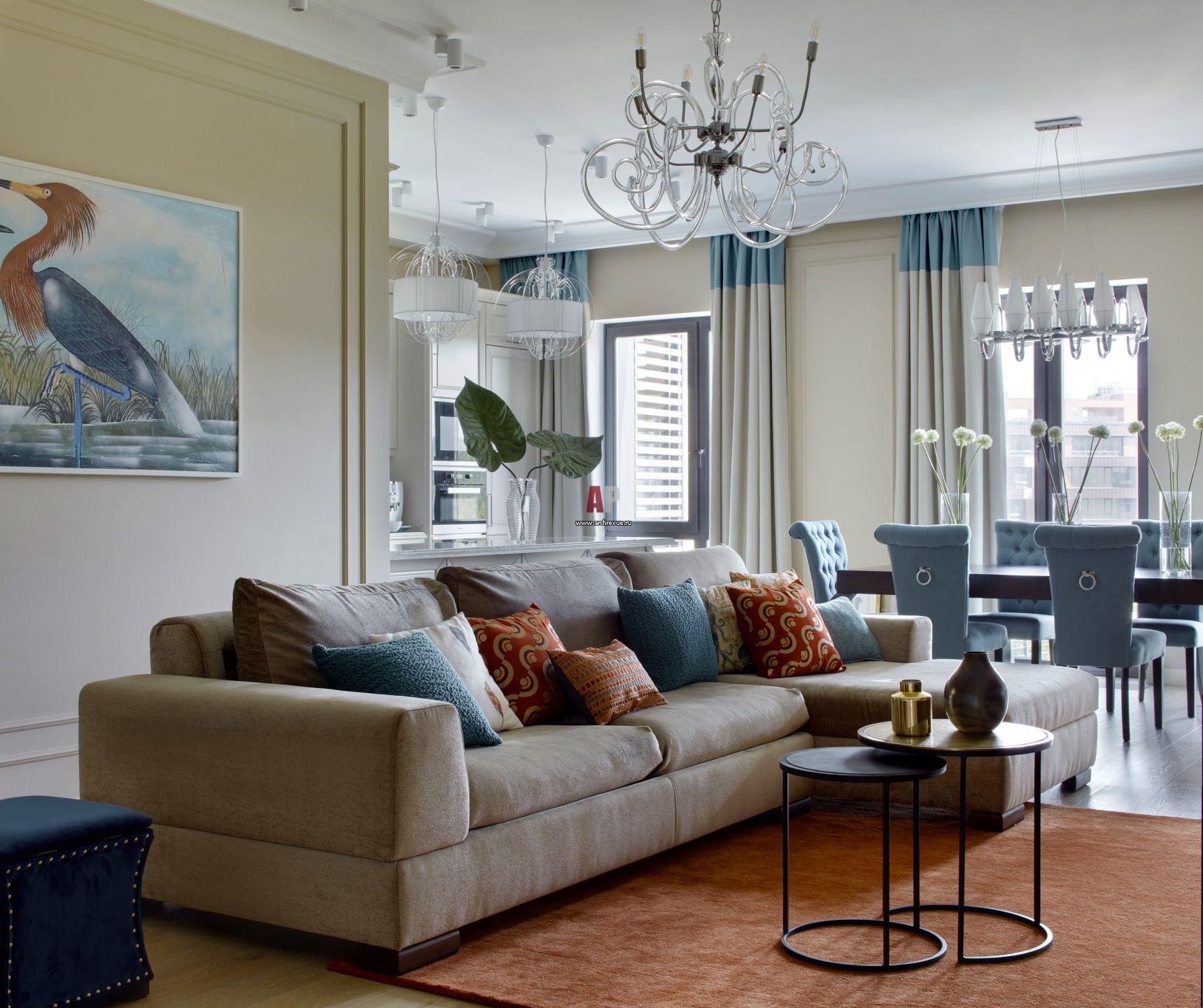 Общая зона гостиной, кухни и столовой. На стене – изображение цапли из альбома натуралиста XIX века Джона Джеймса Одюбона «Птицы Америки». Цвет ее оперения стал основой серо-голубой с рыжими акцентами палитры интерьера.
