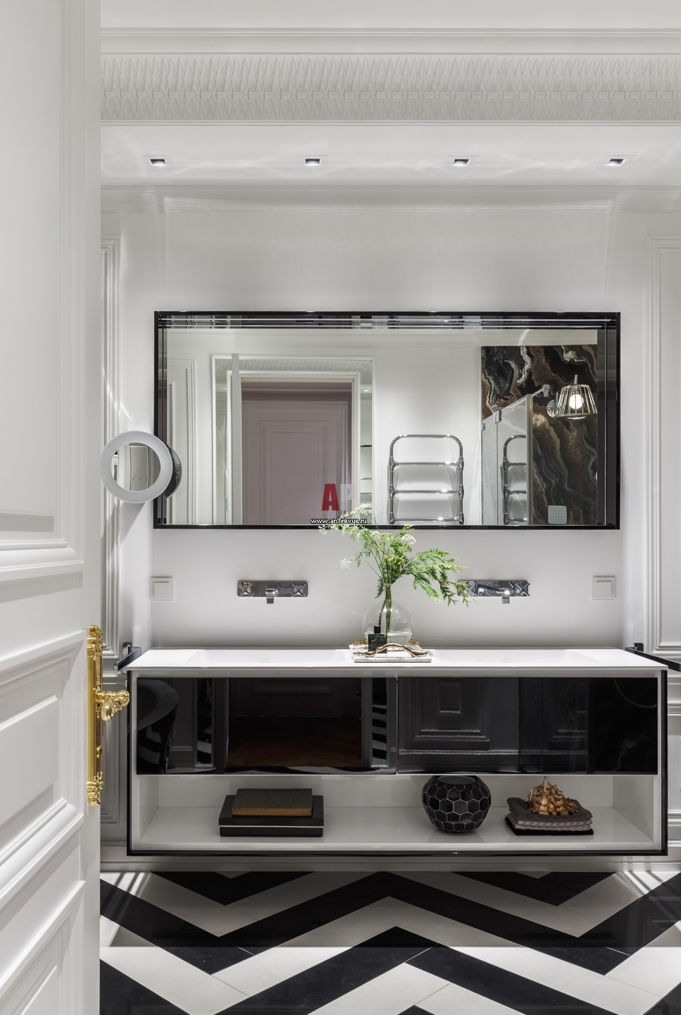 Хозяйская ванная комната. На полу – крупноформатная «елка» из черно-белого кварцевого камня. Мебель, Oasis. Широкий лепной гипсовый карниз визуально увеличивает высоту и рифмуется с раскладкой пола. Лепнина, компания «Петергоф».