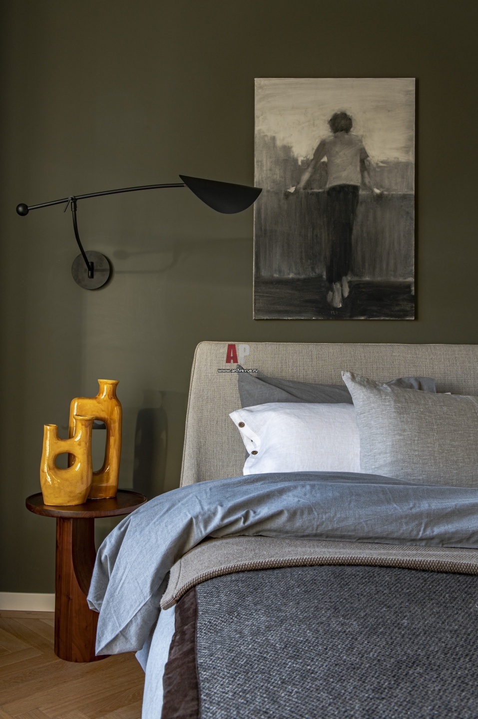 Хозяйская спальня с темной болотной палитрой.