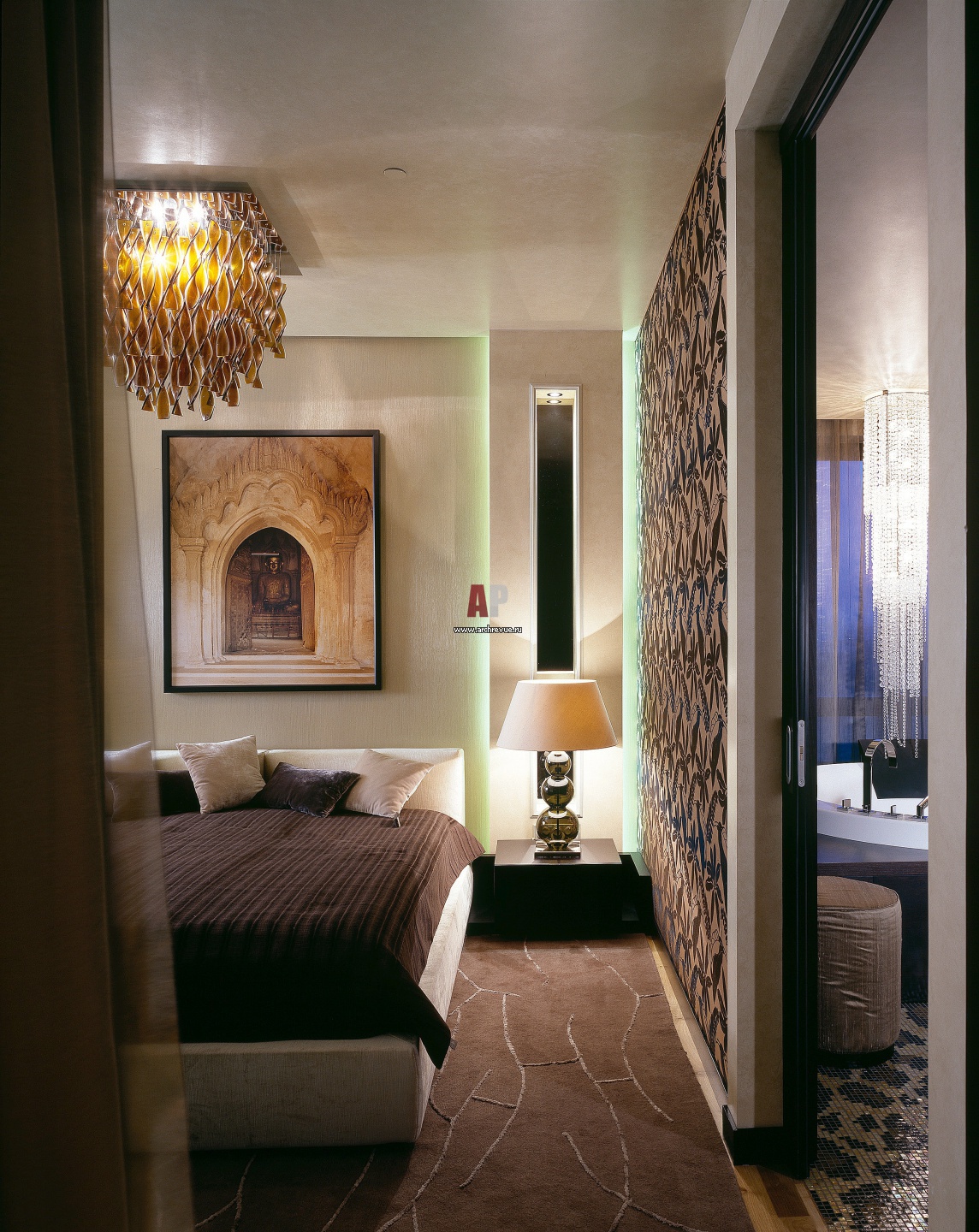 Фото интерьера спальни в бежево-шоколадных тонах. Стены обиты тканью с активным растительным рисунком. Кровать, тумбочки, Poliform. Справа – выход в роскошную ванную с окном.