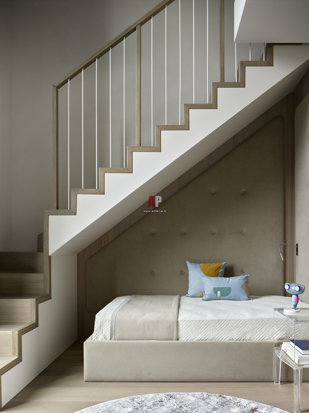 Вторая детская. Столярные изделия сделаны на заказ. В нишу под лестницей встроена кровать.