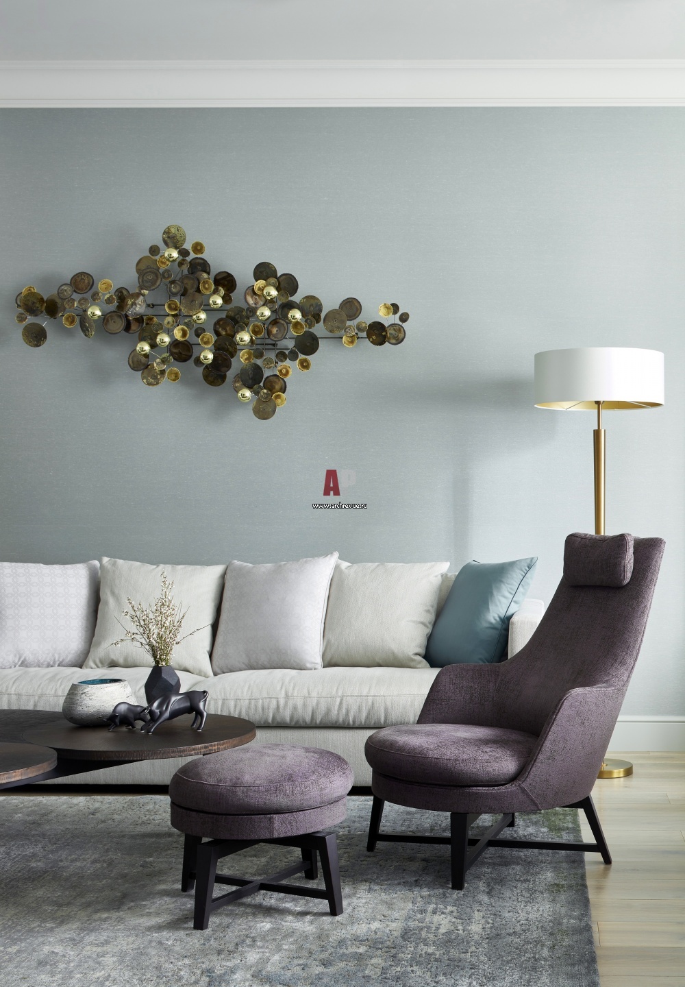 Семейная квартира в светлых жемчужно-голубых тонах. «Бесшовные» текстильные обои, Omexco. Кресло с банкеткой, Flexform. Столик, The Sofa & Chair Company. Диван, Meridiani. Торшер, Heathfield & Co.