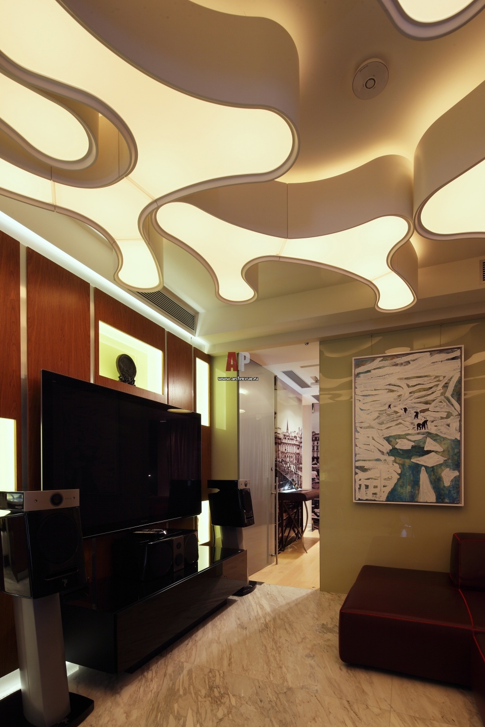 Все помещения в квартире расположены на одной оси. Выход в спальню сделан из гостиной. Центральный художественный элемент квартиры – композиция из потолочных светильников Vibia, Ameba.