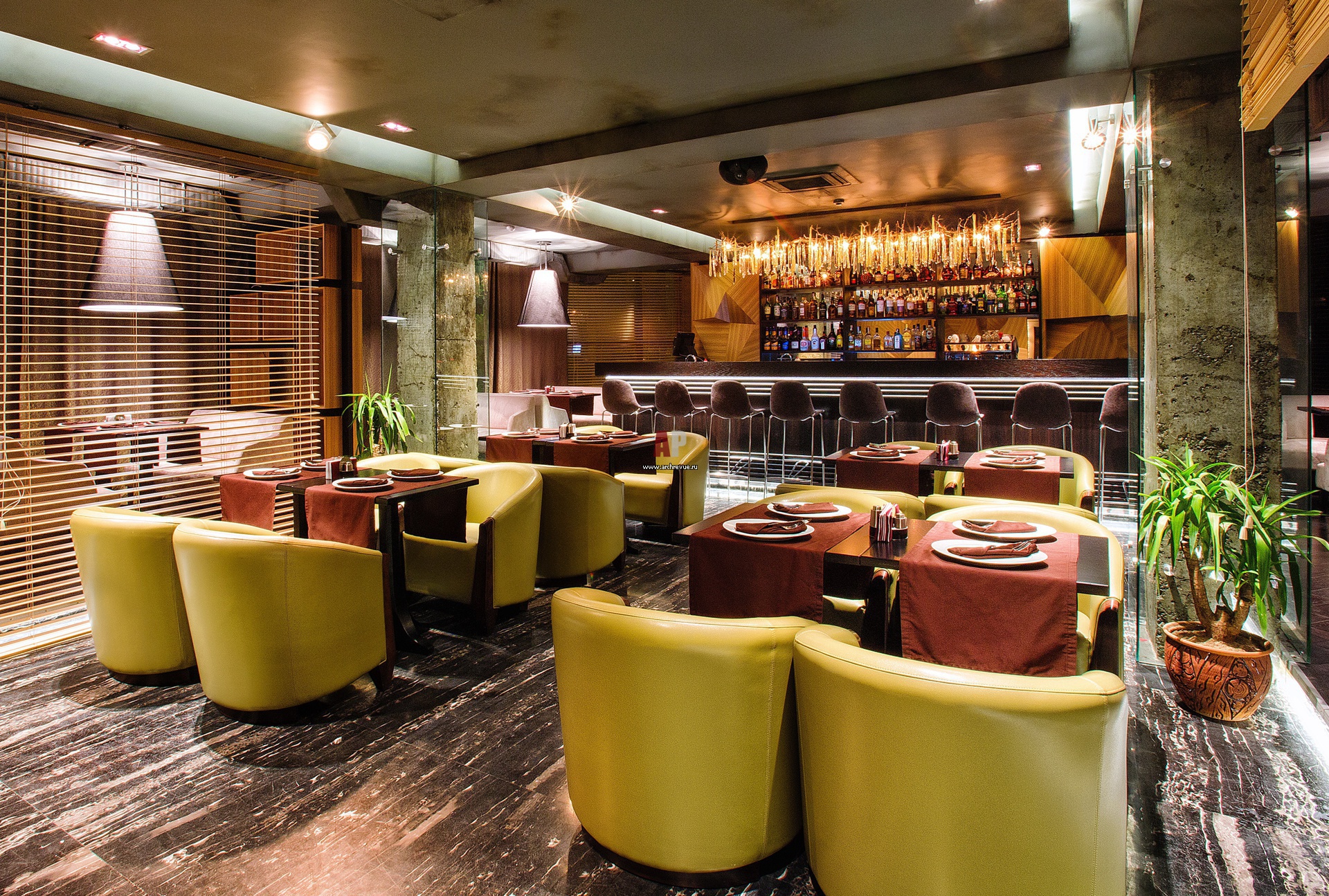 На нижнем уроне находится зона бара с ланужем. Интересная деталь – ломаная стена за барной стойкой. Она выполнена из МДФ с лакированным шпоном ореха и собрана на месте. С ней гармонирует светильник с подвесками-каплями, сделанными вручную на фабрике в Португалии. Кожаные кресла цвета свежей зелени оживляют интерьер.