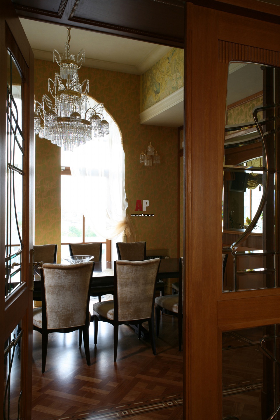 Вид из гостиной на столовую. Двухстворчатые распашные двери уже были смонтированы, когда декоратор подключилась к работе. Чтобы они гармонировали с остальным интерьерным обликом, их реставрировали и перекрашивали.