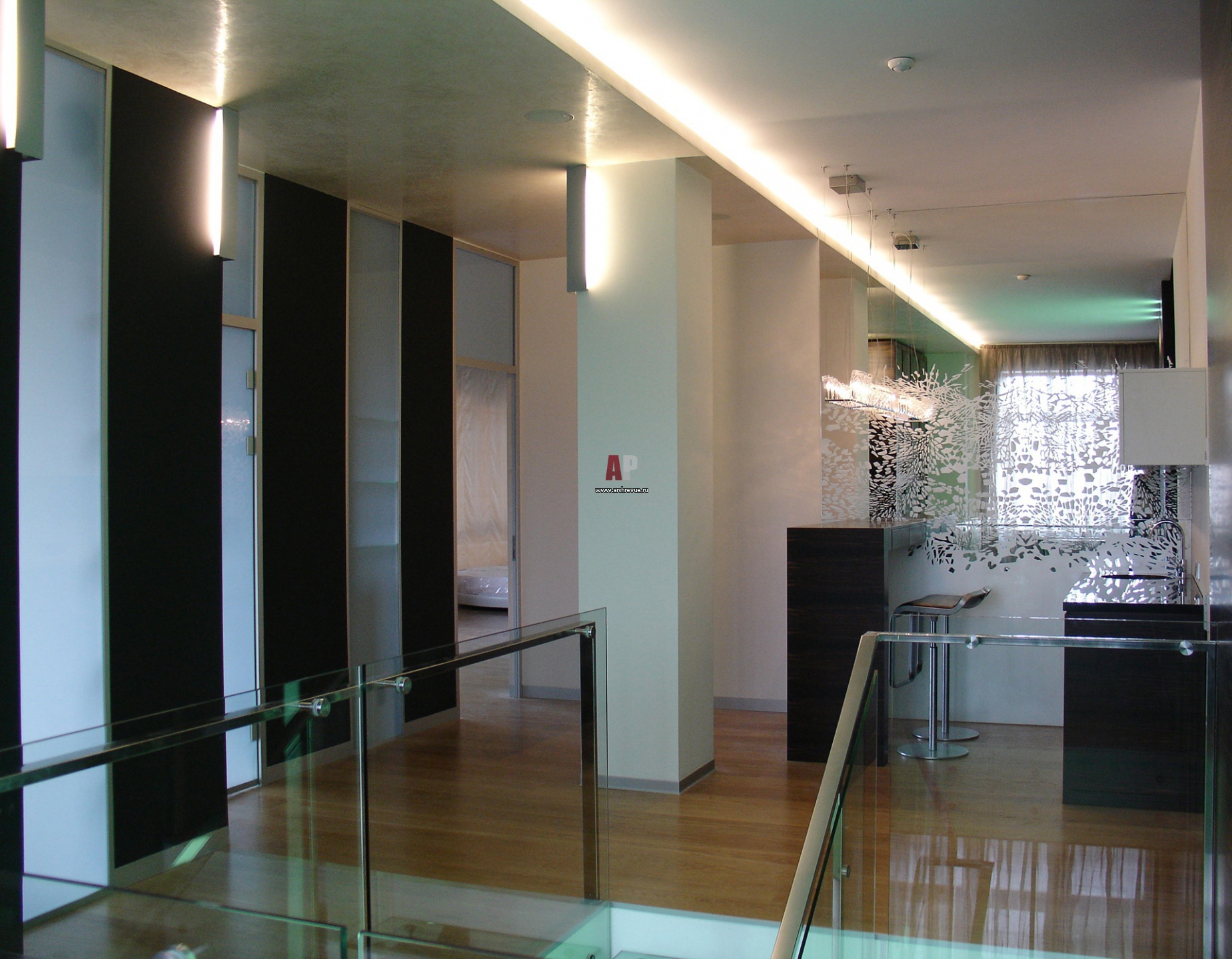 Бар с винотекой на лестничном холле второго этажа. На торцевой стене - зеркало с травленым рисунком в виде сосновых шишек.