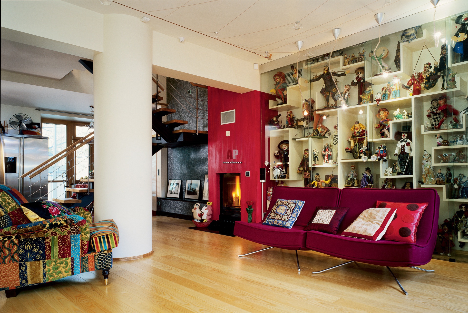 Зона отдыха с камином. Выступающий из стены дымоход камина оформлен декоративными штукатурками пурпурного цвета. Современный модульный стеллаж с коллекцией авторских кукол занимает всю стену. Необарочное кресло обито тканью в технике печворк.